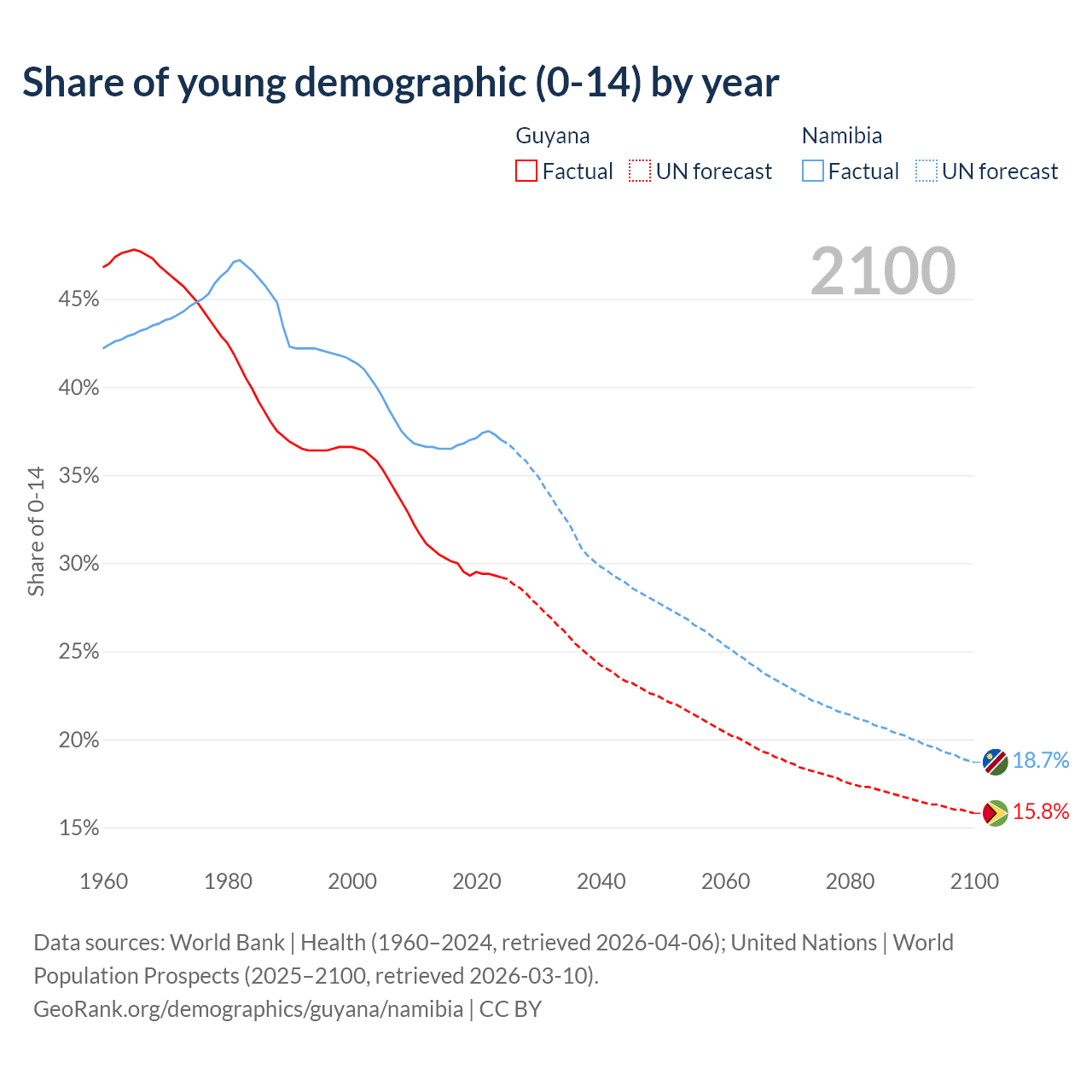 - Guyana is ranked 122/196 by median age (oldest to youngest) vs 147/196 for Namibia.