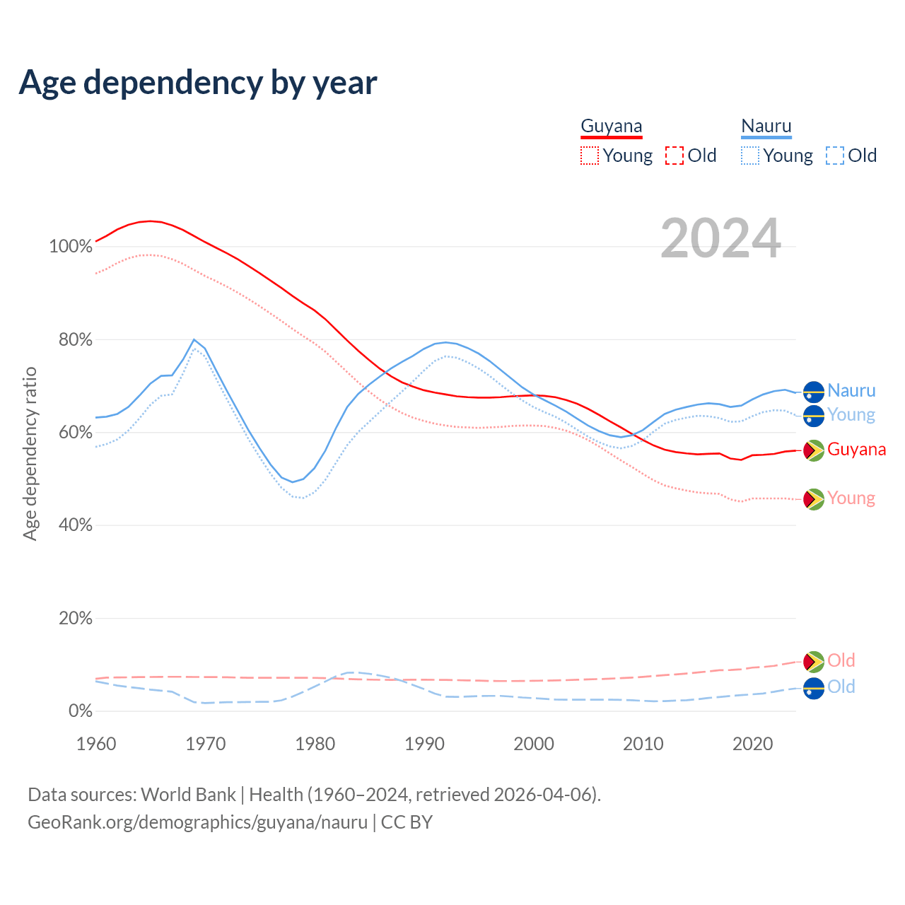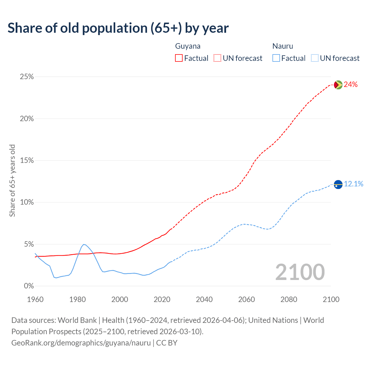 - The share of old-age demographic (65+) in Guyana is 6.73% vs 2.85% in Nauru.
