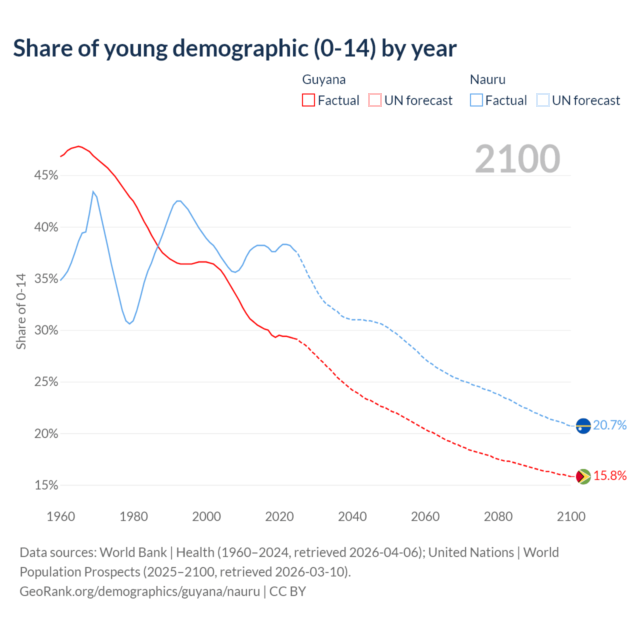 - The share of young demographic (0-15 years old) in Guyana is 29.2% vs 37.8% in Nauru.