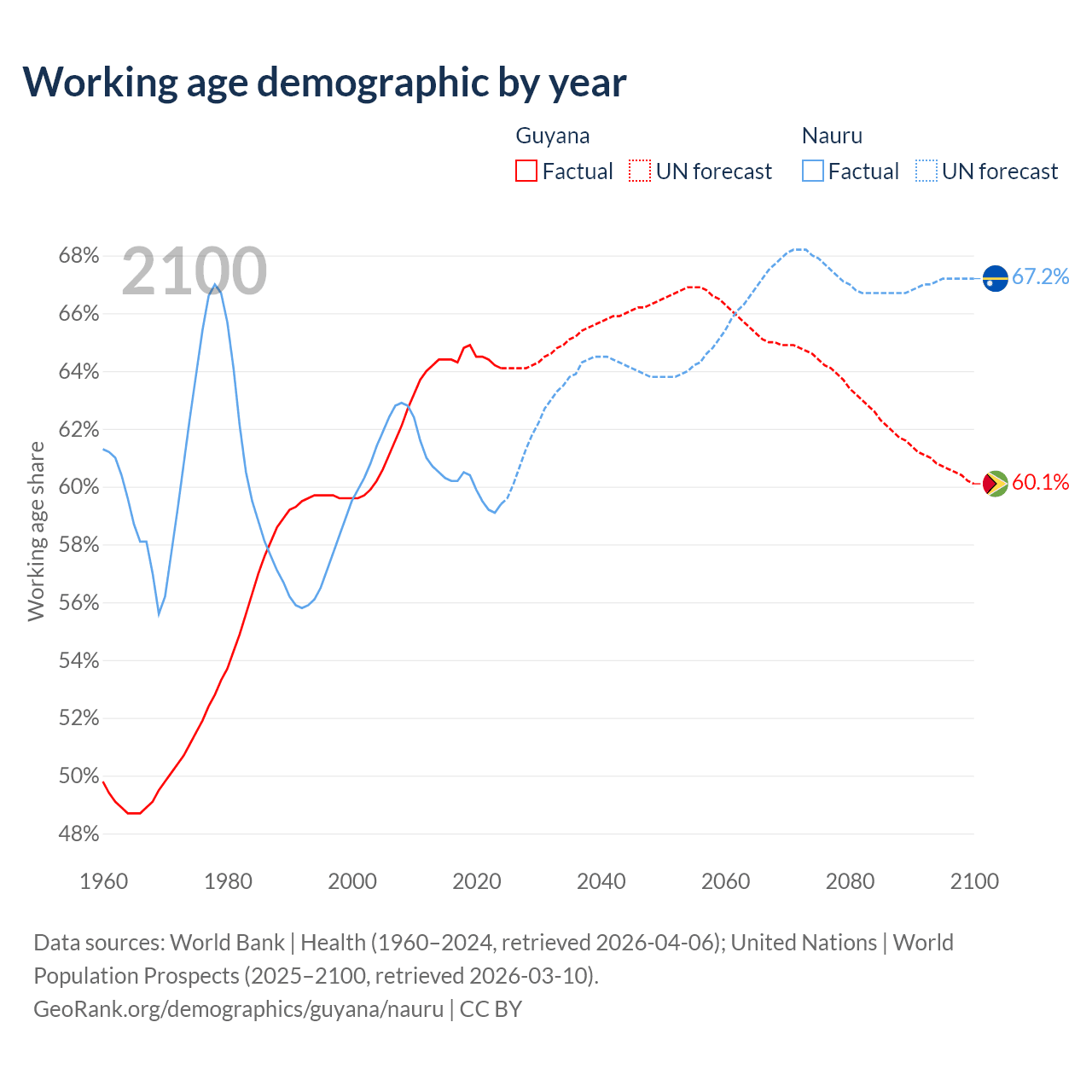 - Guyana has 540K working age adults (aged 15-64) vs 7.2K in Nauru.