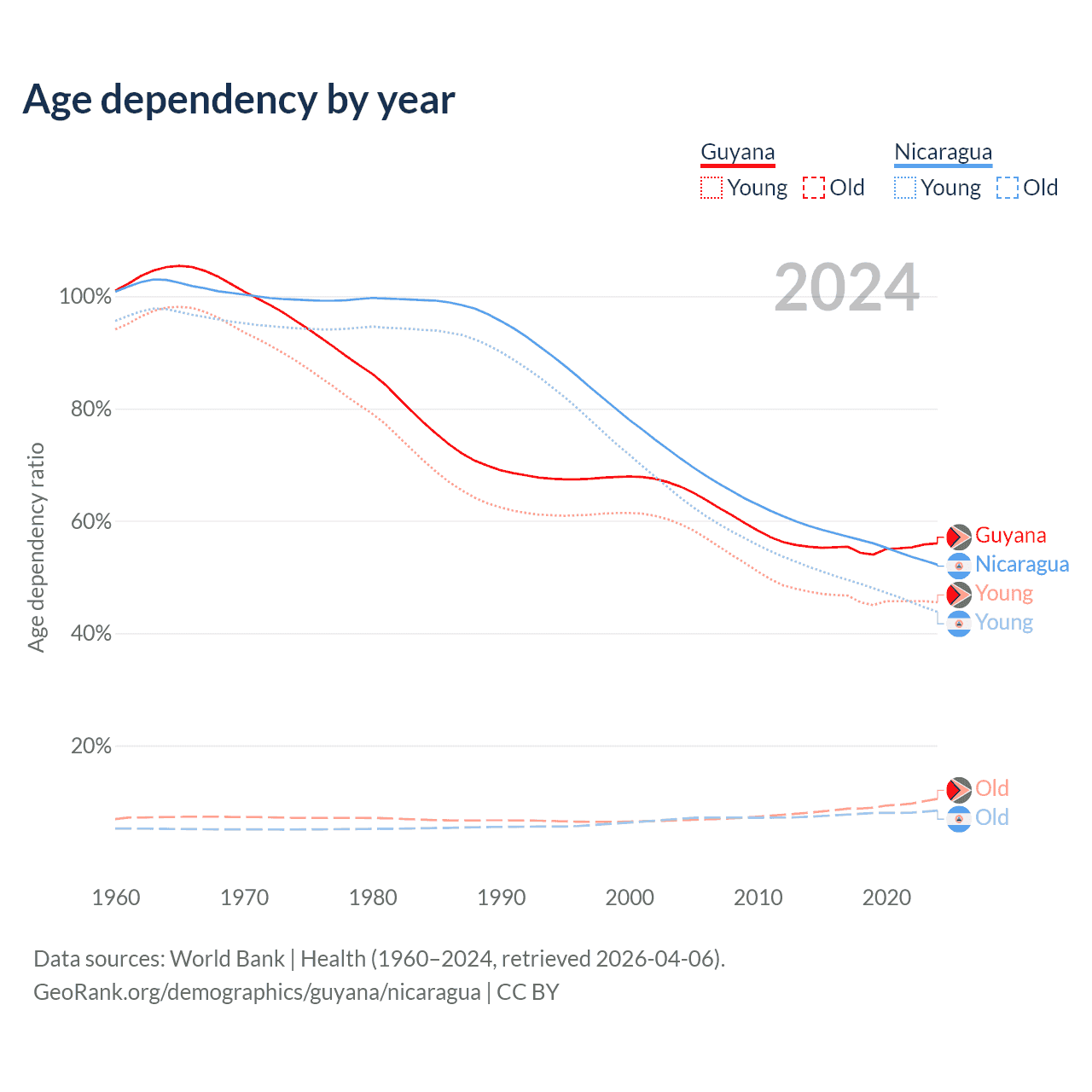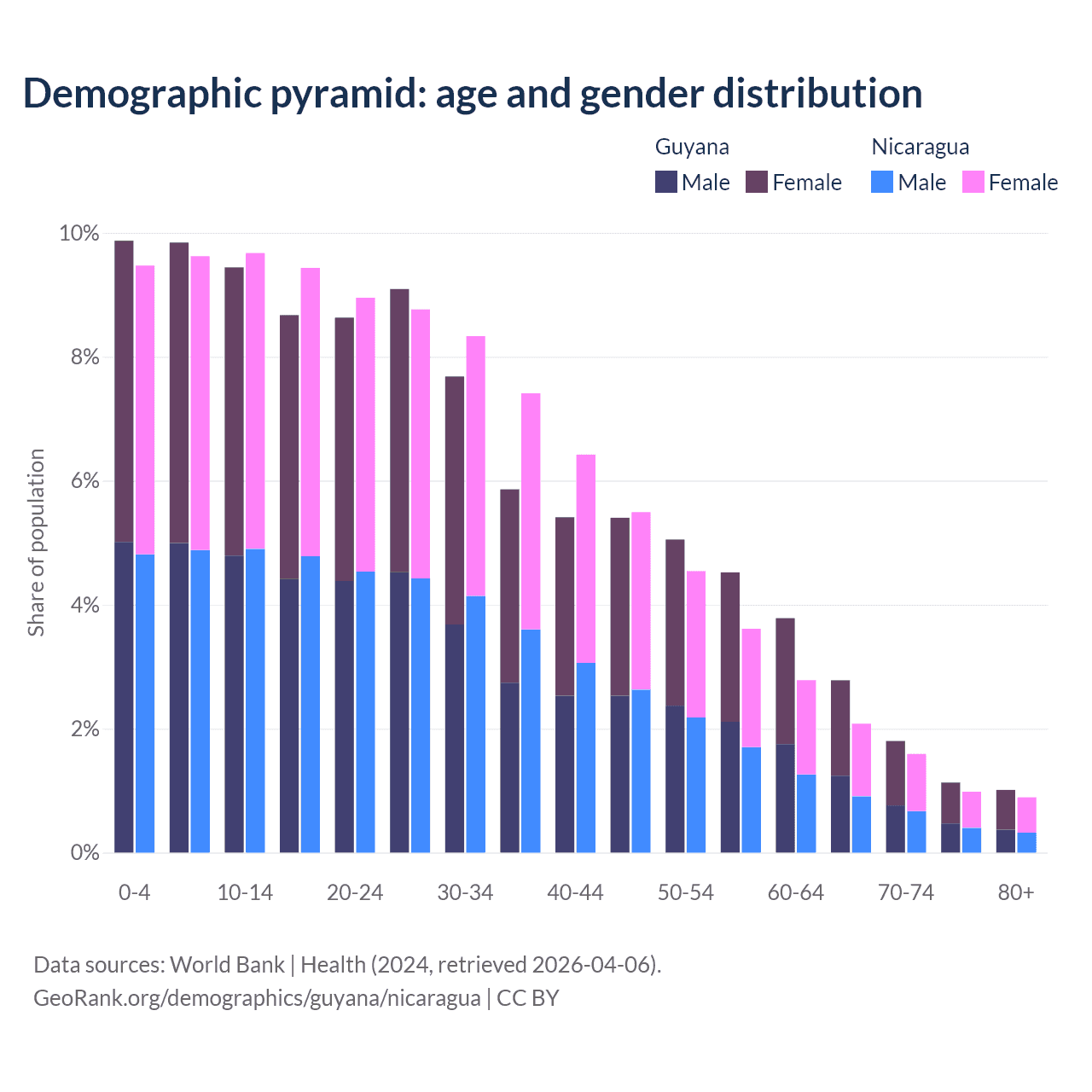 - Guyana is ranked 122/196 by median age (oldest to youngest) vs 125/196 for Nicaragua.