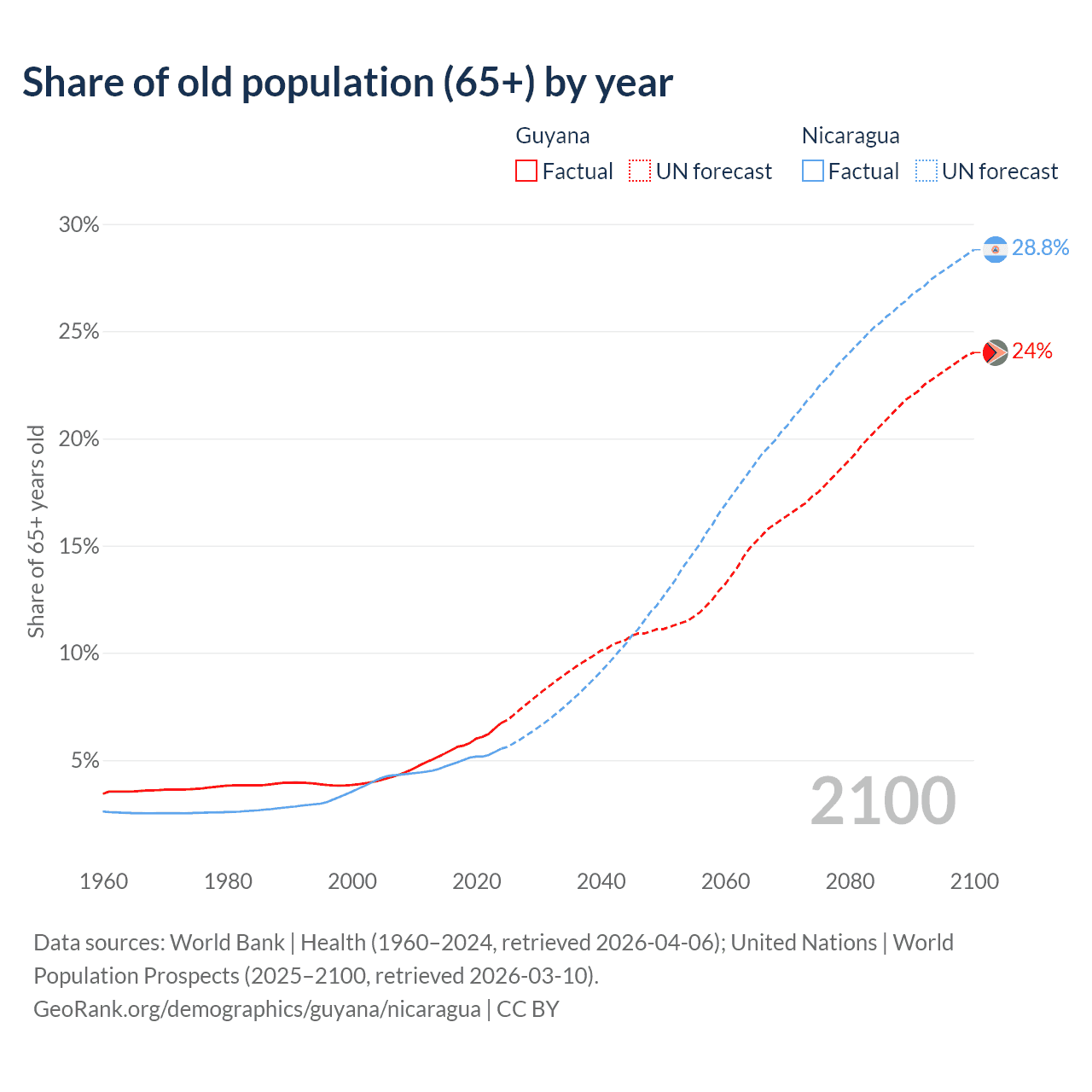 The share of older people aged 65 and over is 6.73% in Guyana and 5.53% in Nicaragua. Life expectancy in Guyana compared to Nicaragua .