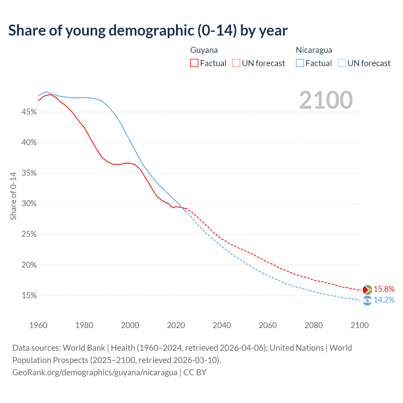 - The share of young demographic (0-15 years old) in Guyana is 29.2% vs 28.8% in Nicaragua.