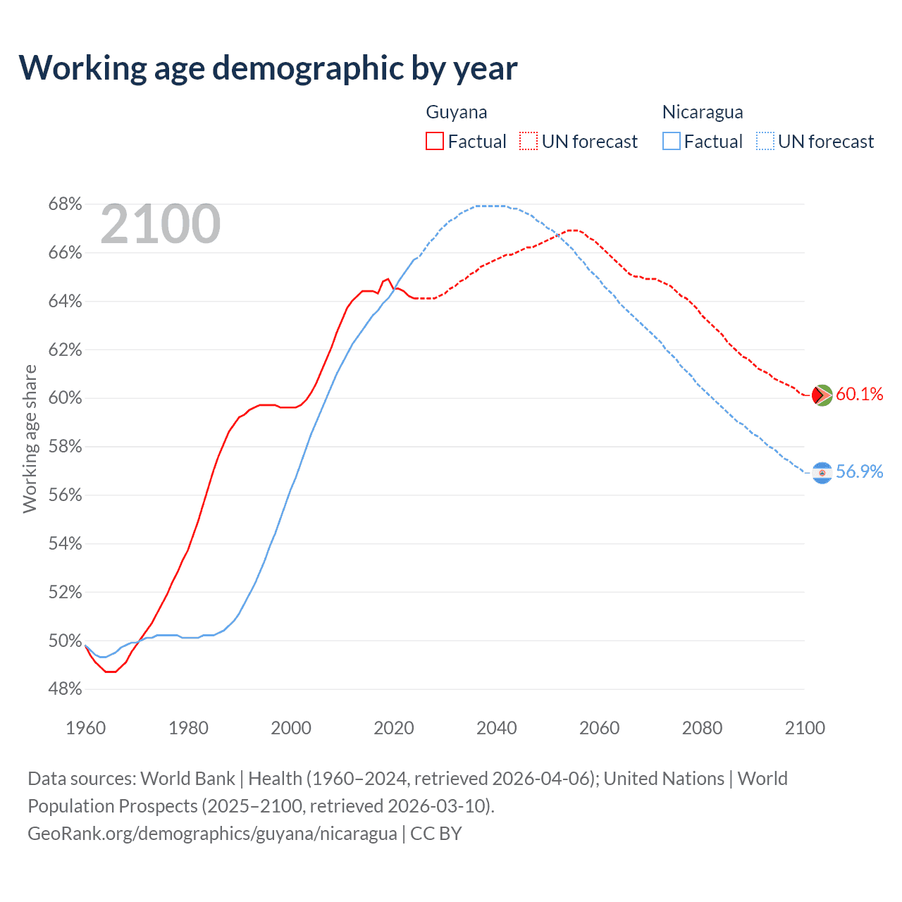 - Guyana has 540K working age adults (aged 15-64) vs 4.68M in Nicaragua.