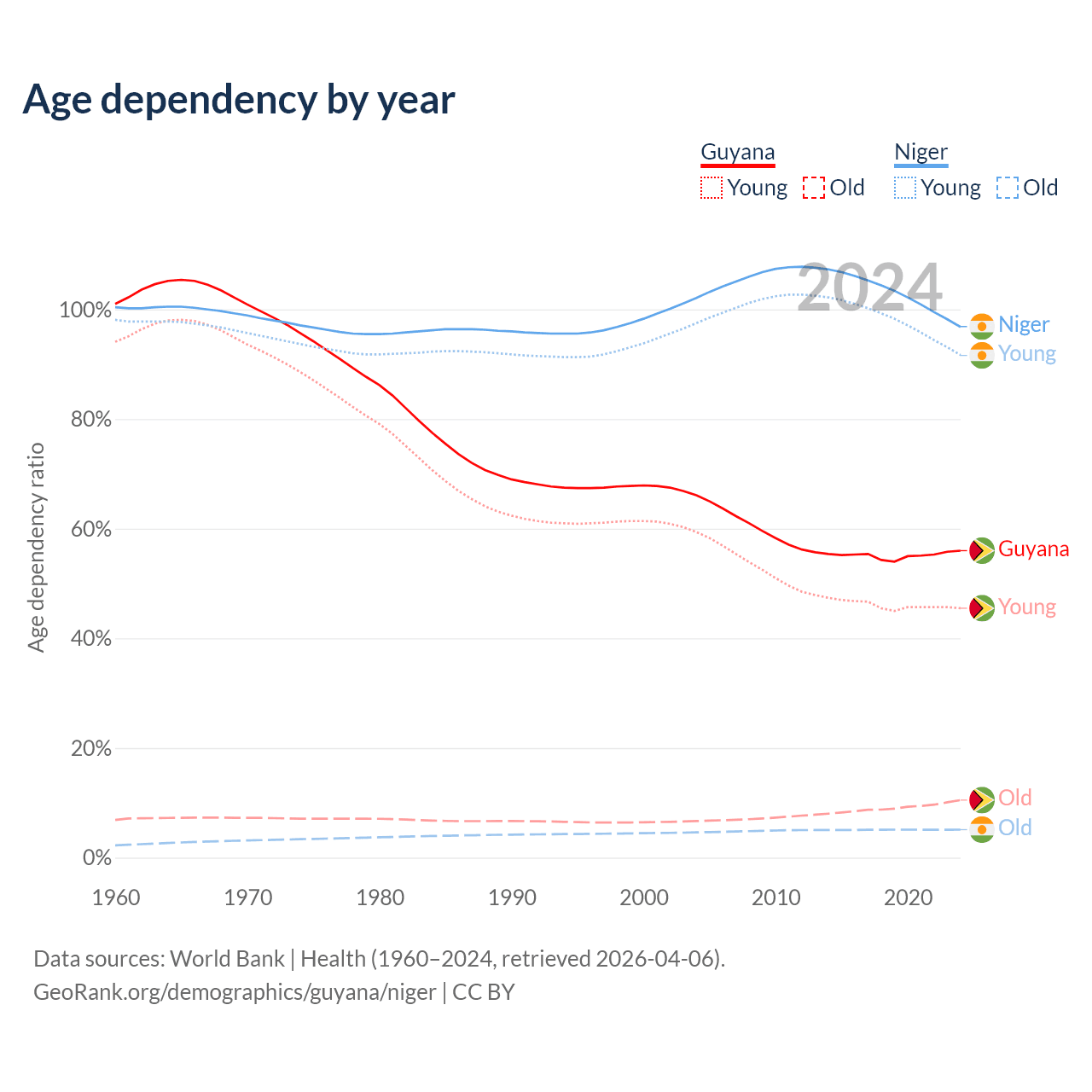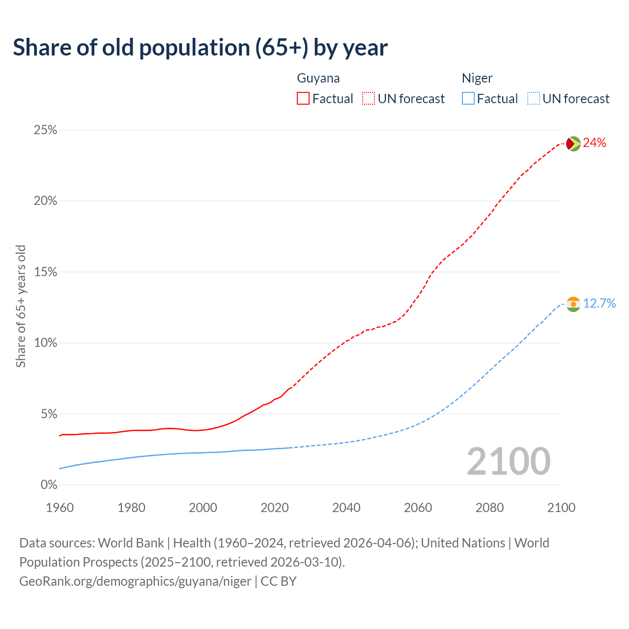 - The share of old-age demographic (65+) in Guyana is 6.73% vs 2.59% in Niger.