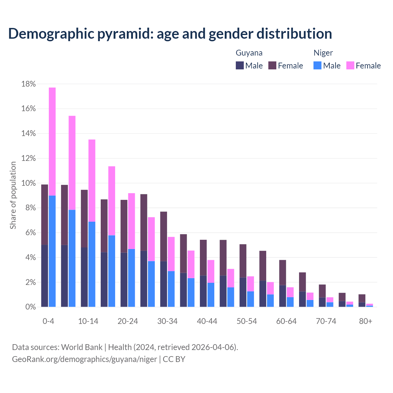 - Guyana is ranked 122/196 by median age (oldest to youngest) vs 195/196 for Niger.