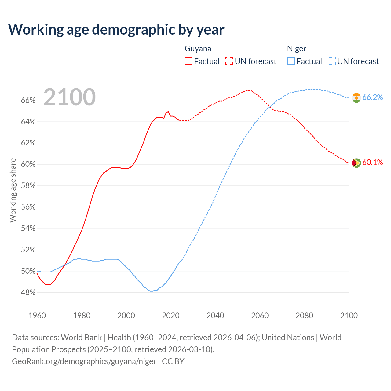 - Guyana has 540K working age adults (aged 15-64) vs 14.8M in Niger.