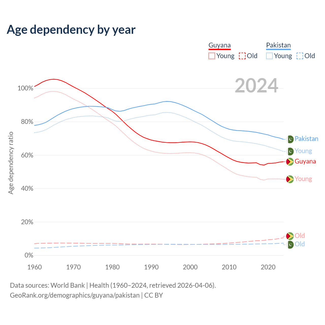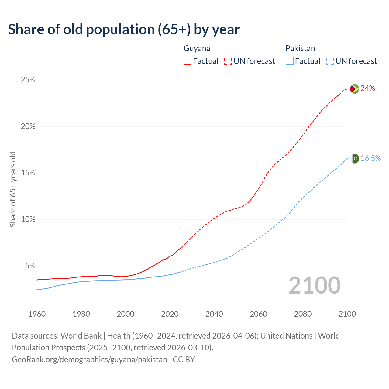 - The share of old-age demographic (65+) in Guyana is 6.73% vs 4.28% in Pakistan.
