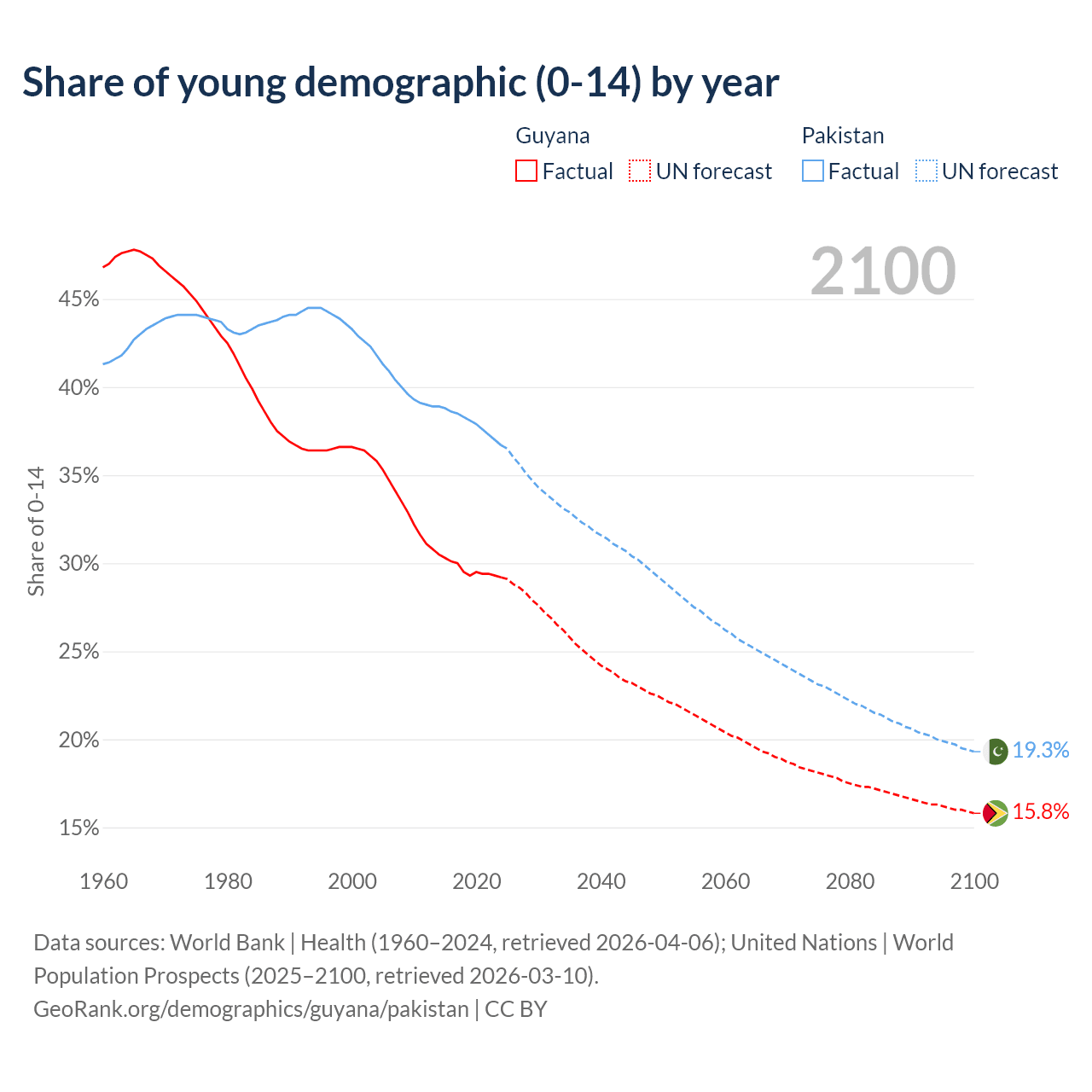 - The share of young demographic (0-15 years old) in Guyana is 29.2% vs 36.7% in Pakistan.