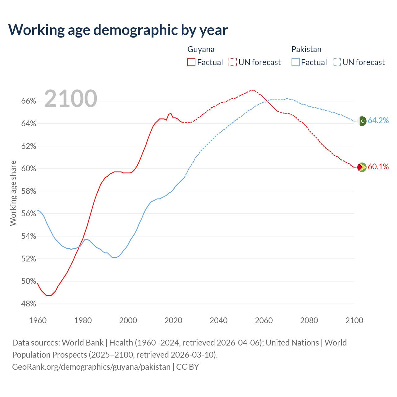 Median age Guyana vs Pakistan, 1960-2100