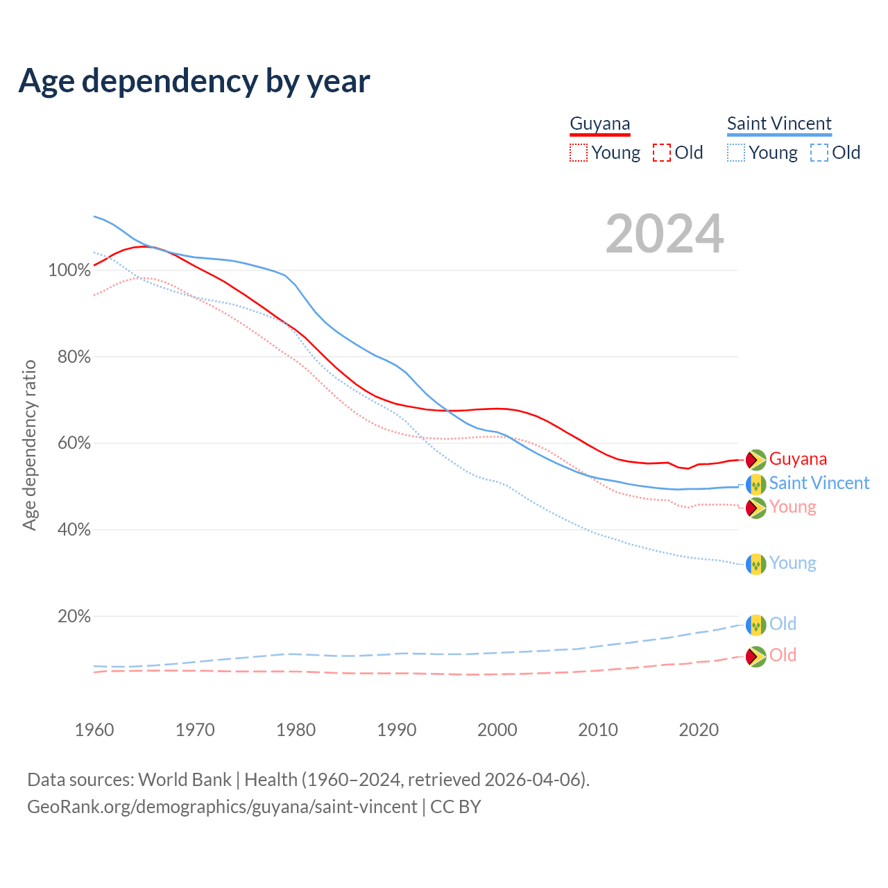 - The share of young demographic (0-15 years old) in Guyana is 29.2% vs 21.3% in Saint Vincent.