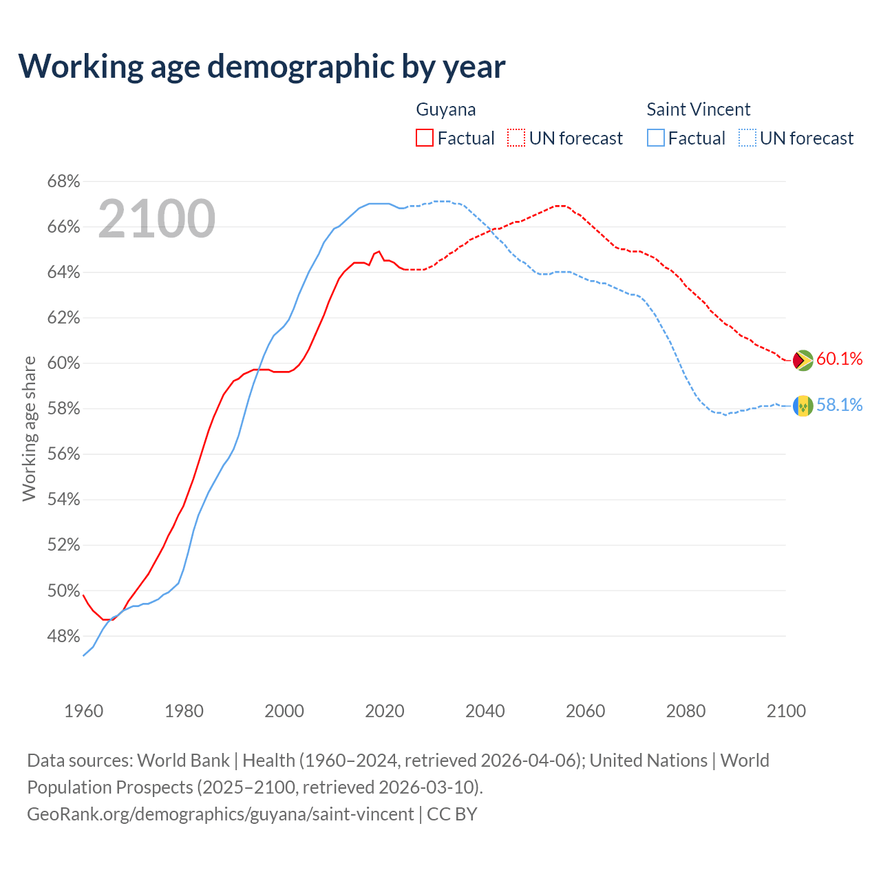 - Guyana has 540K working age adults (aged 15-64) vs 66.3K in Saint Vincent.