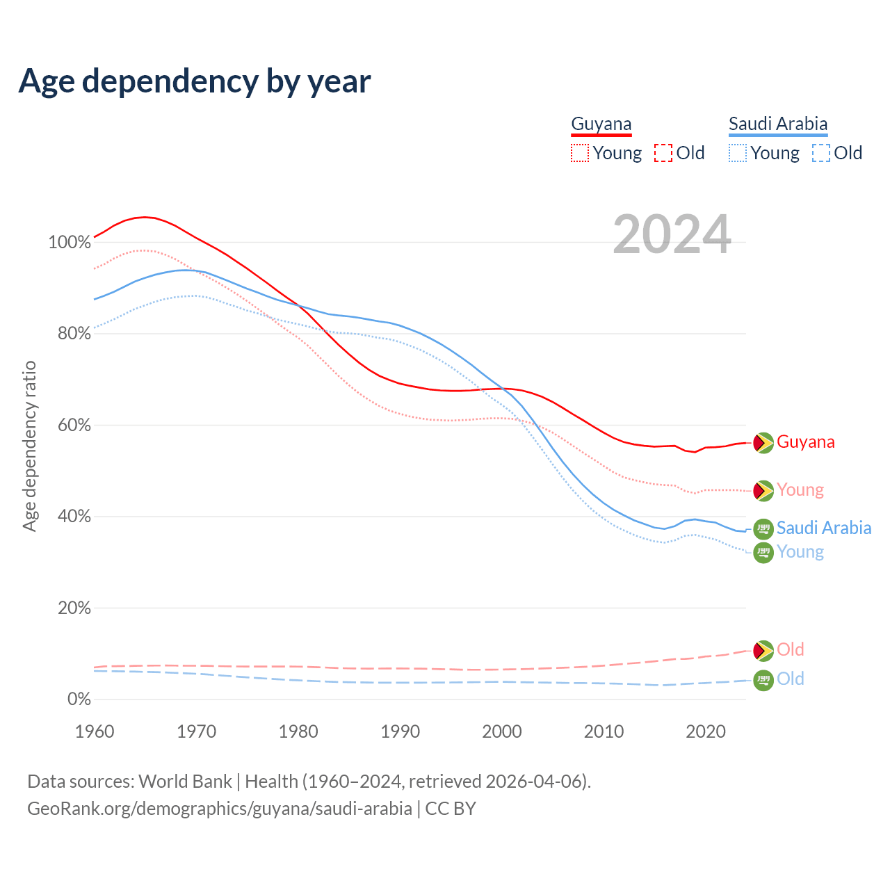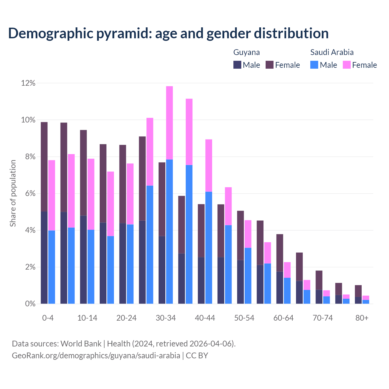 - Guyana is ranked 122/196 by median age (oldest to youngest) vs 98/196 for Saudi Arabia.