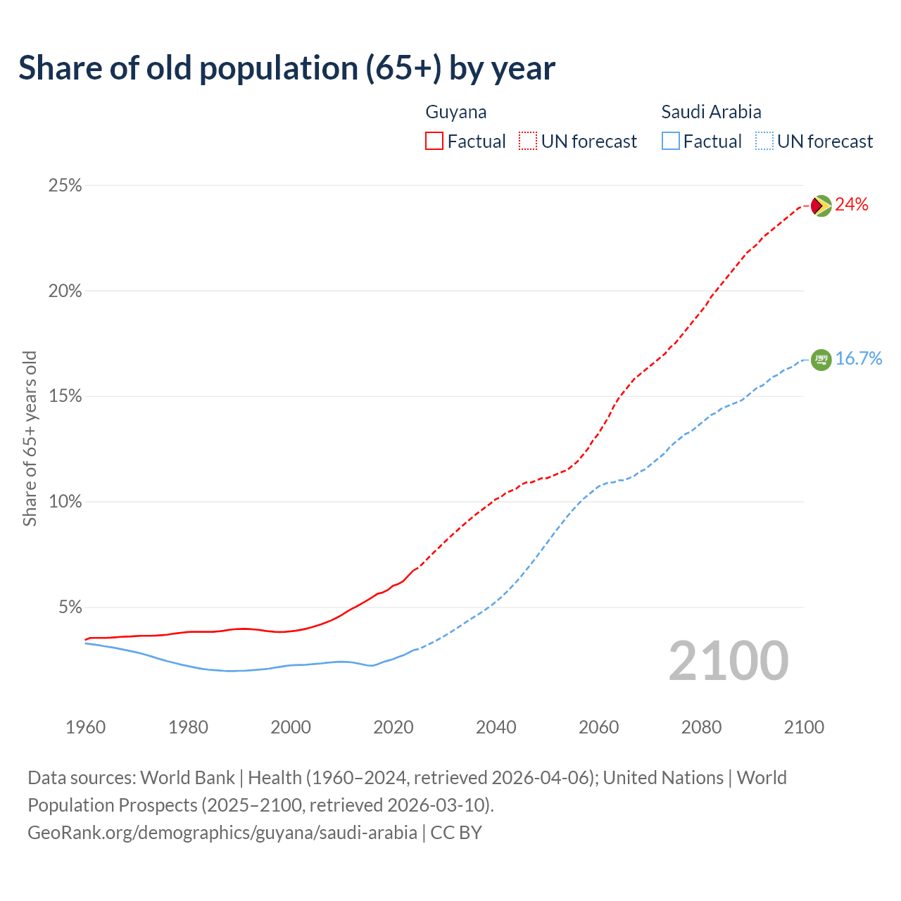 - The share of old-age demographic (65+) in Guyana is 6.73% vs 2.95% in Saudi Arabia.