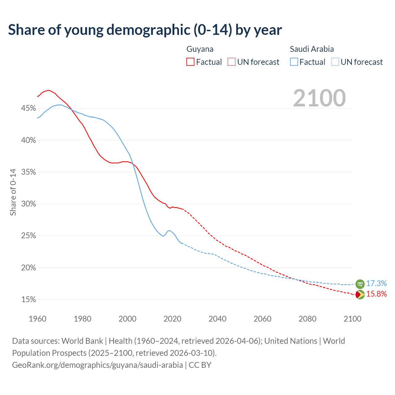 - The share of young demographic (0-15 years old) in Guyana is 29.2% vs 23.8% in Saudi Arabia.