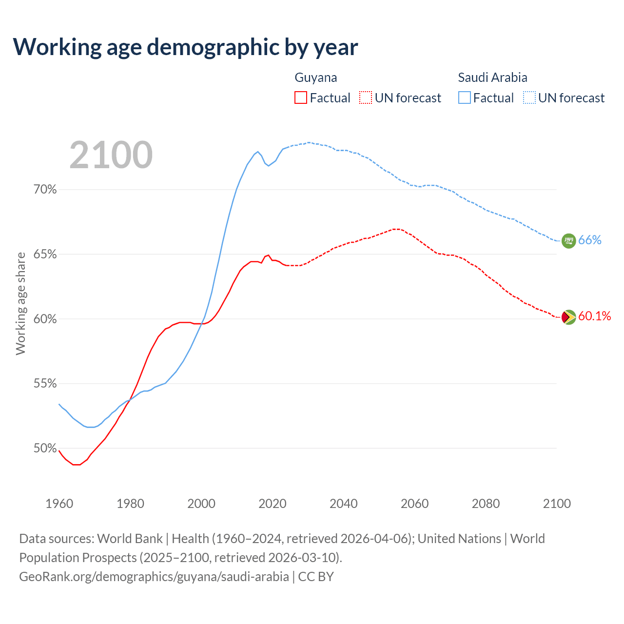 - Guyana has 540K working age adults (aged 15-64) vs 26.9M in Saudi Arabia.