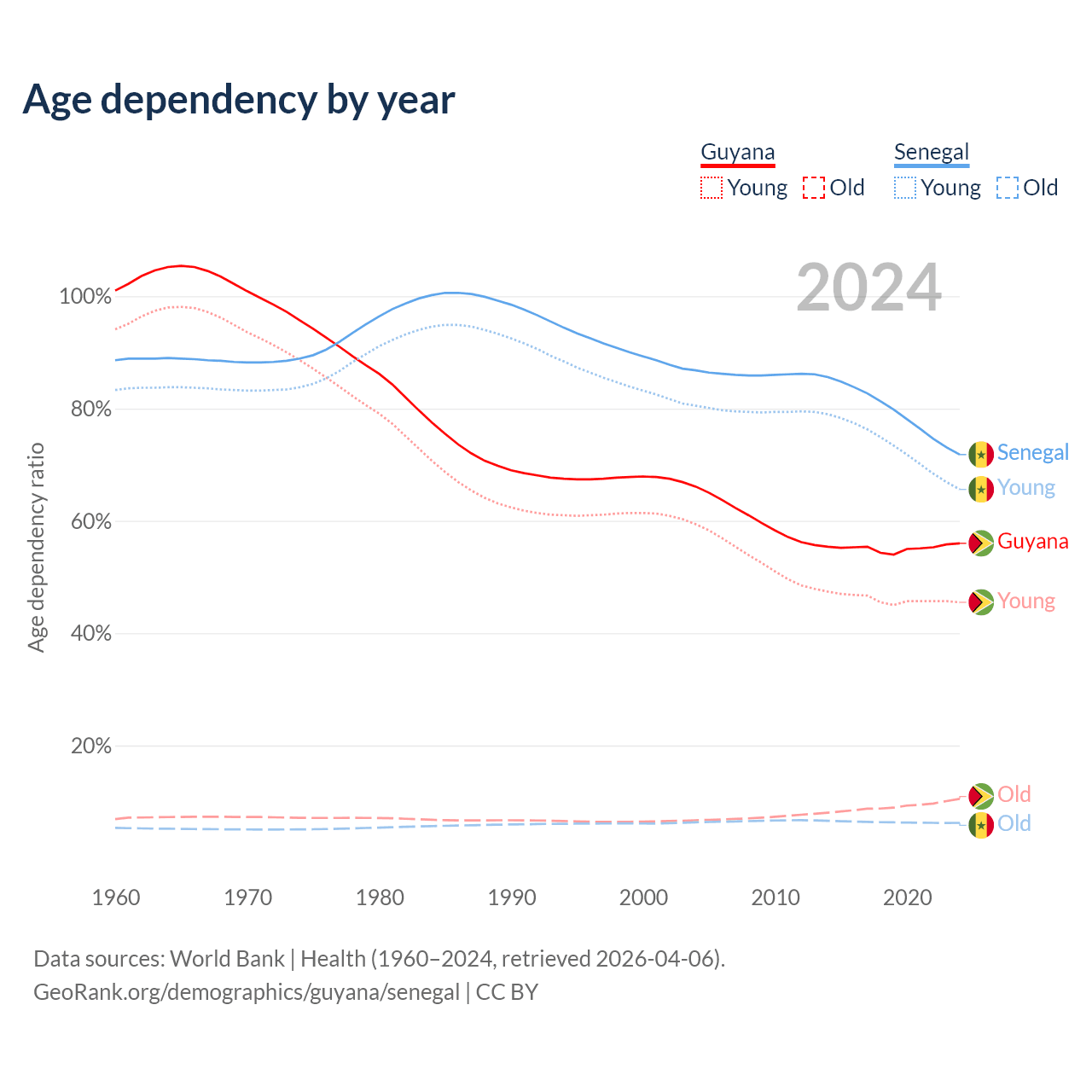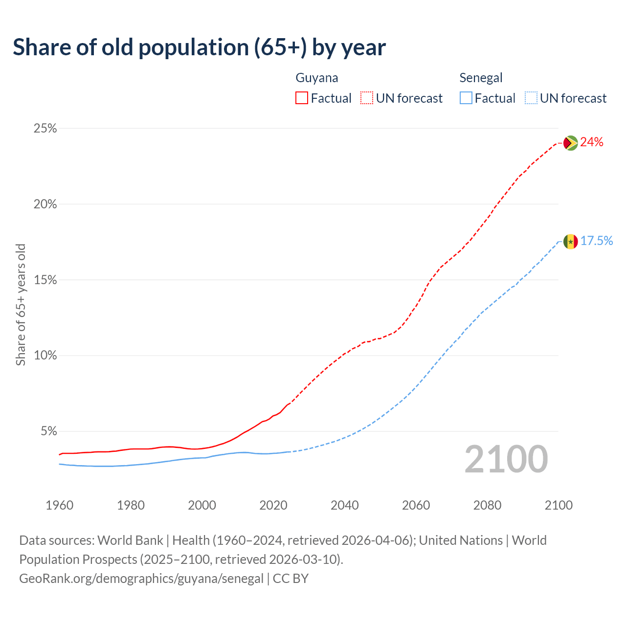 - The share of old-age demographic (65+) in Guyana is 6.73% vs 3.62% in Senegal.