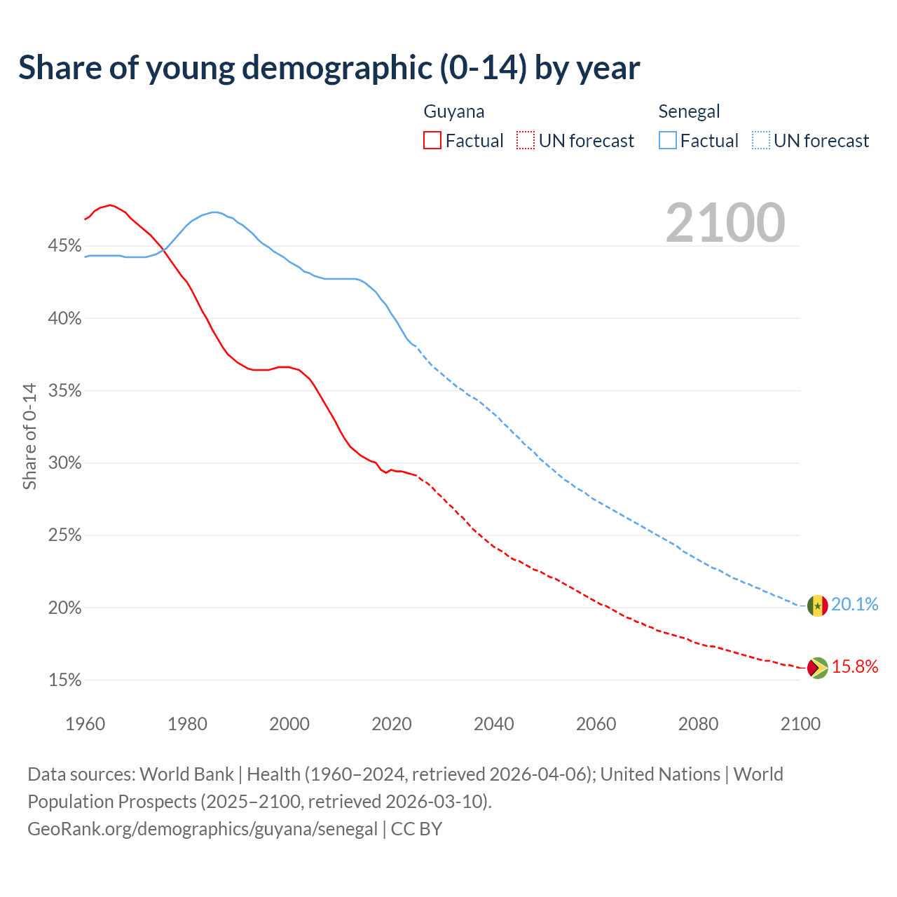 Median age Guyana vs Senegal, 1960-2100