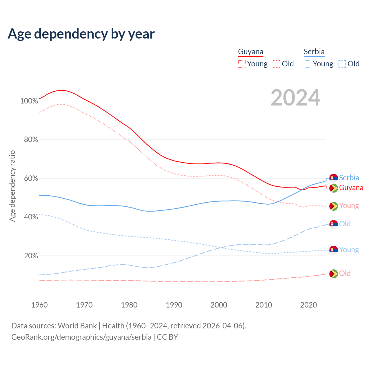 - Guyana is ranked 122/196 by median age (oldest to youngest) vs 15/196 for Serbia.
