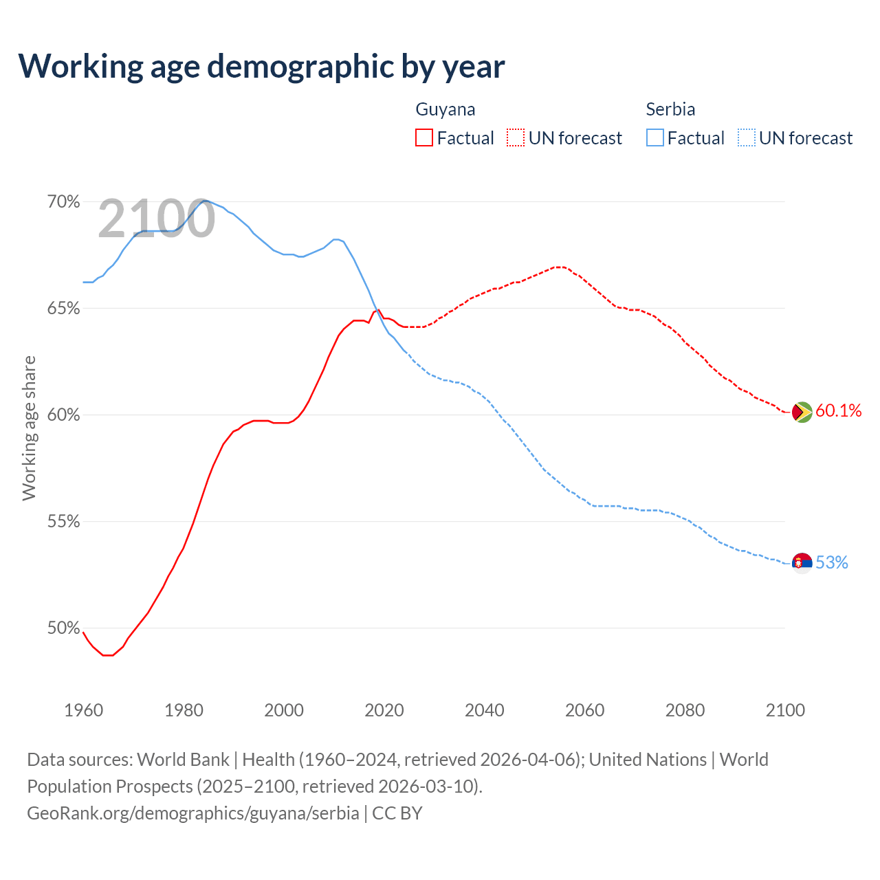 Median age Guyana vs Serbia, 1960-2100