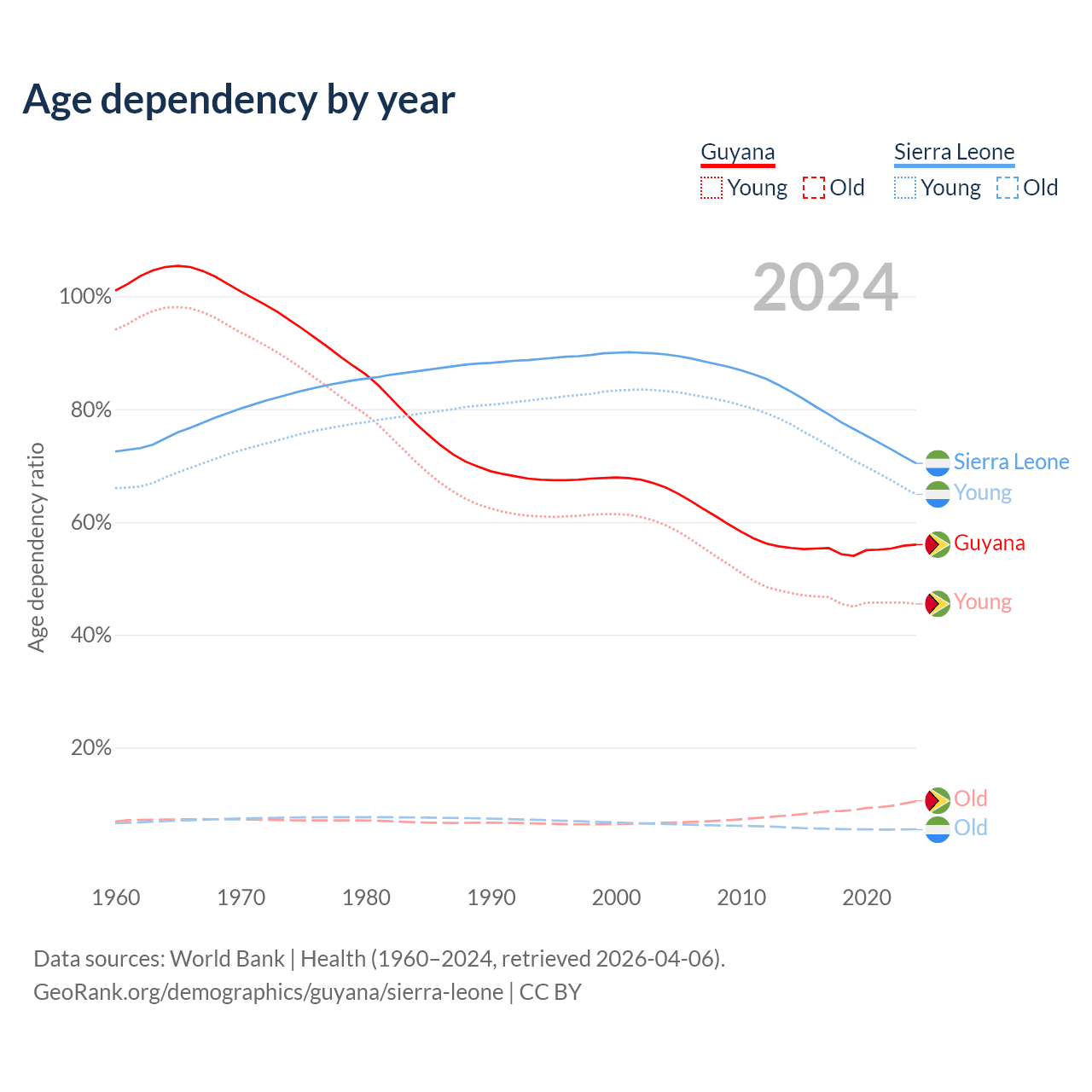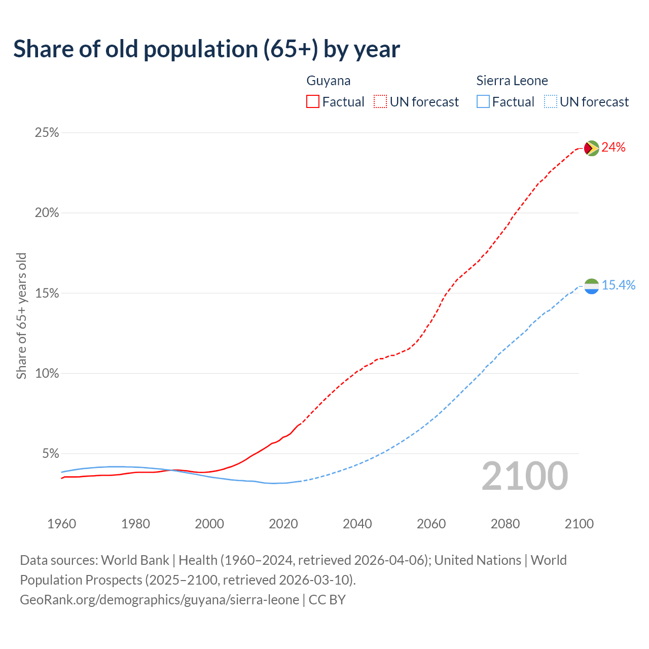 - The share of old-age demographic (65+) in Guyana is 6.73% vs 3.24% in Sierra Leone.