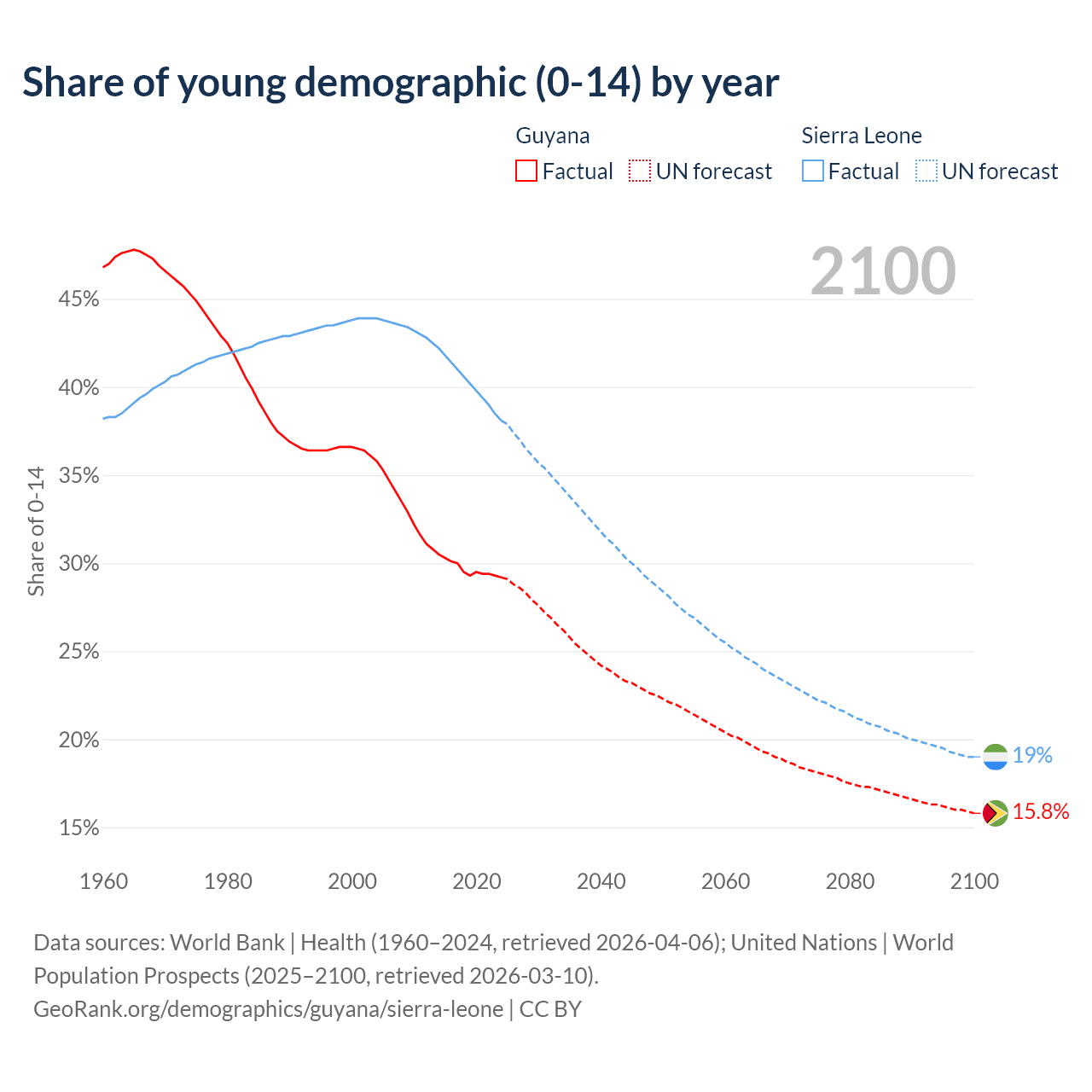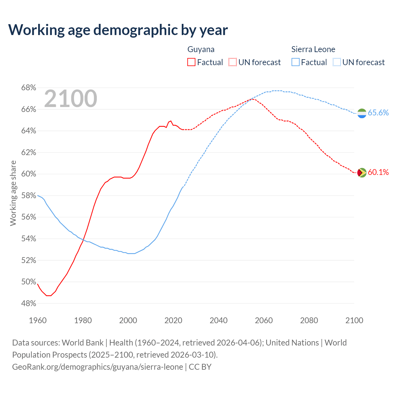 Median age Guyana vs Sierra Leone, 1960-2100