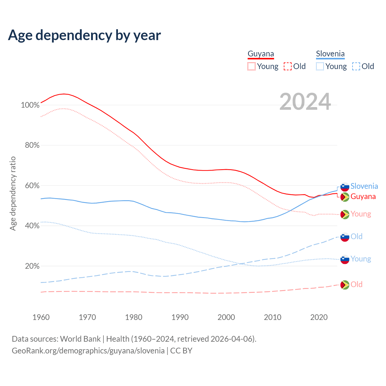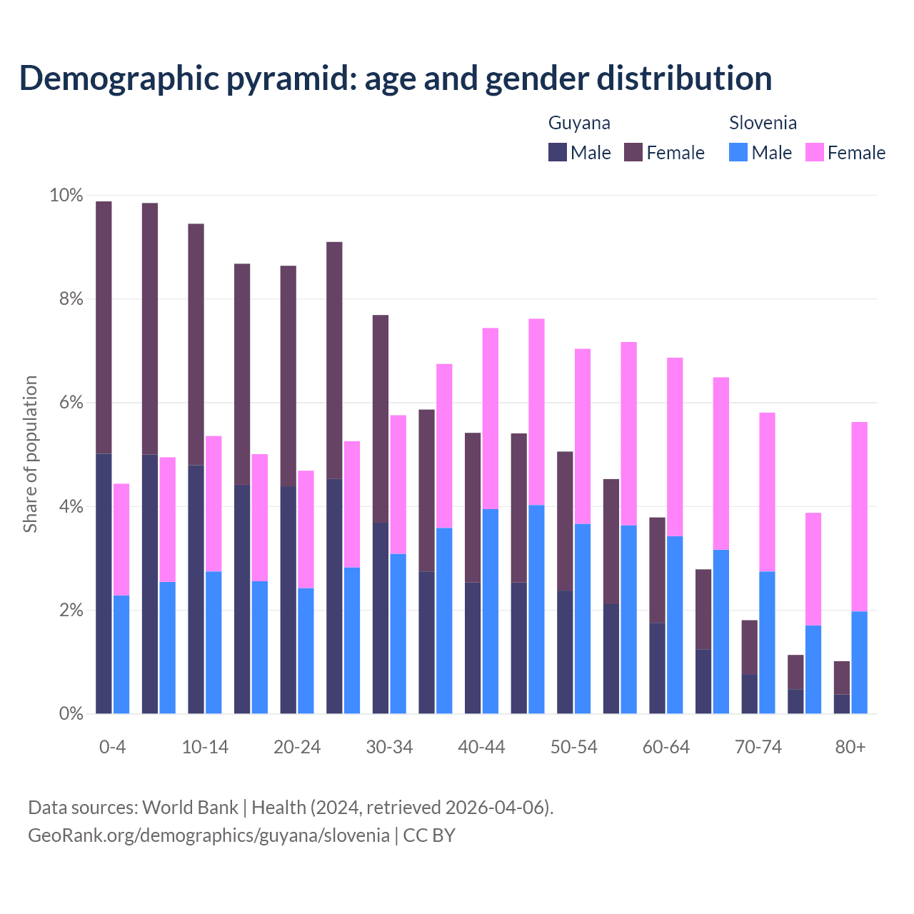- Guyana is ranked 122/196 by median age (oldest to youngest) vs 14/196 for Slovenia.