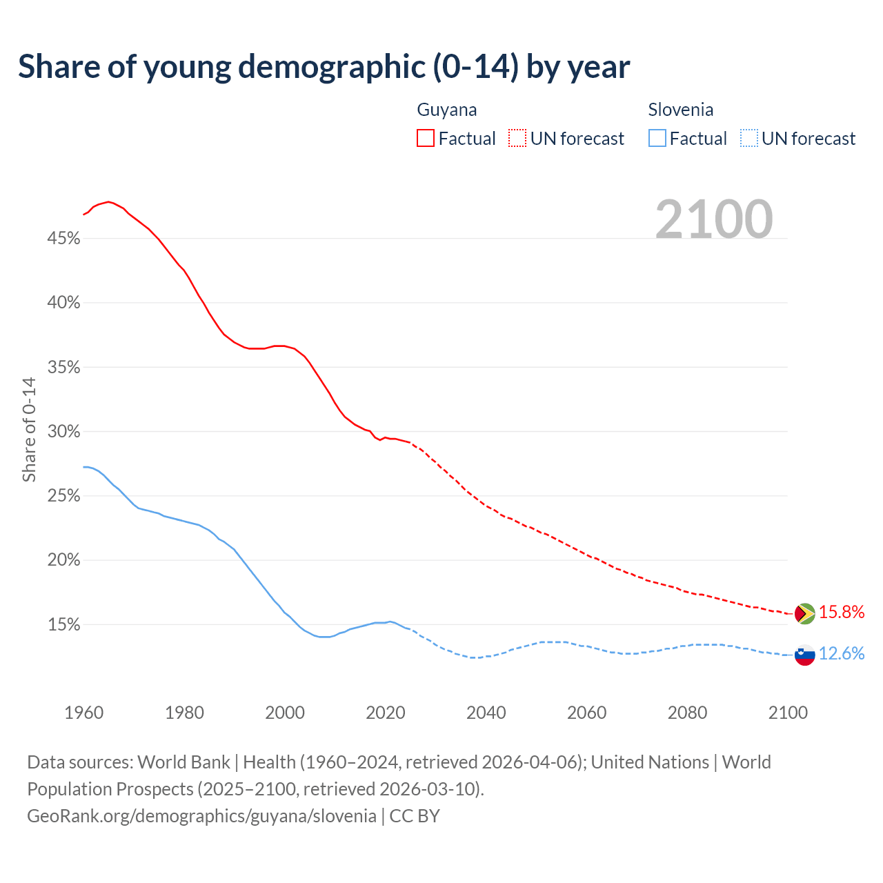 - The share of young demographic (0-15 years old) in Guyana is 29.2% vs 14.7% in Slovenia.