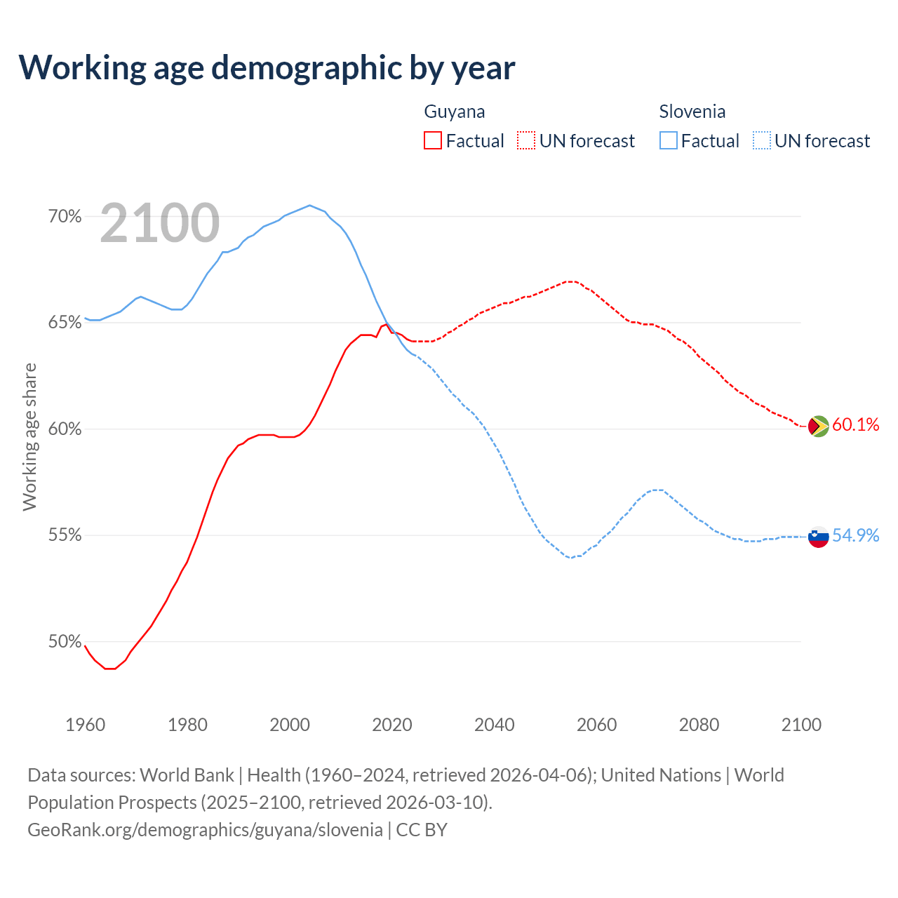 - Guyana has 540K working age adults (aged 15-64) vs 1.35M in Slovenia.