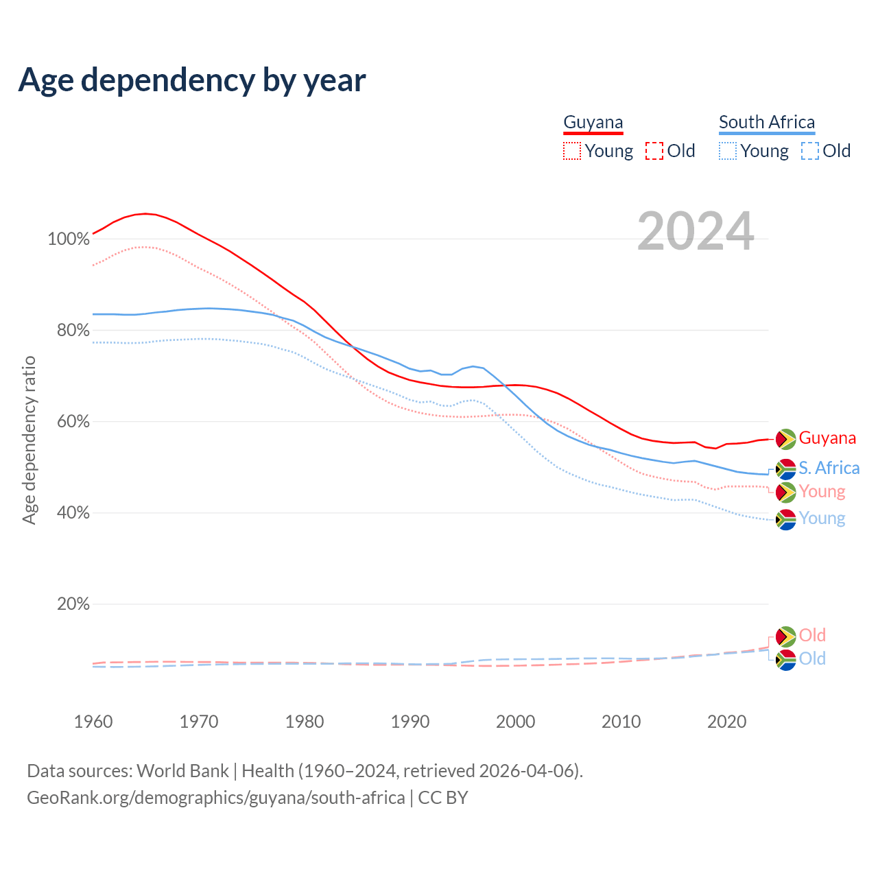 Data sources: World Bank | Health (1960–2024, retrieved 2026-04-06); U.S. Census Bureau (1960–2024, retrieved 2026-02-08).