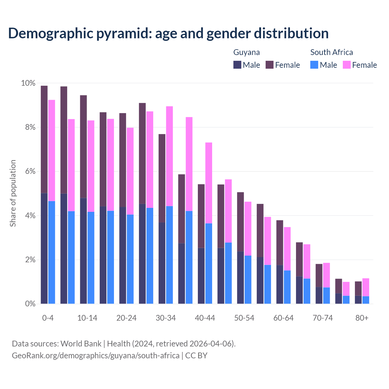 - Guyana is ranked 122/196 by median age (oldest to youngest) vs 107/196 for South Africa.