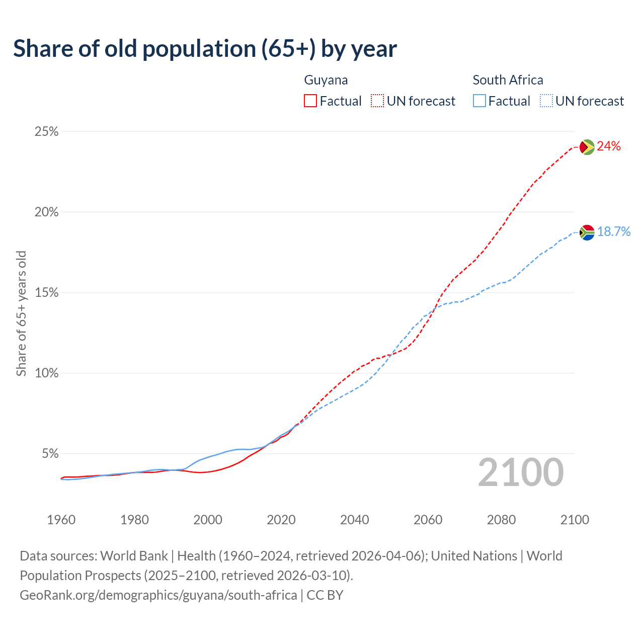 The share of older people aged 65 and over is 6.73% in Guyana and 6.69% in South Africa. Life expectancy in Guyana compared to South Africa .