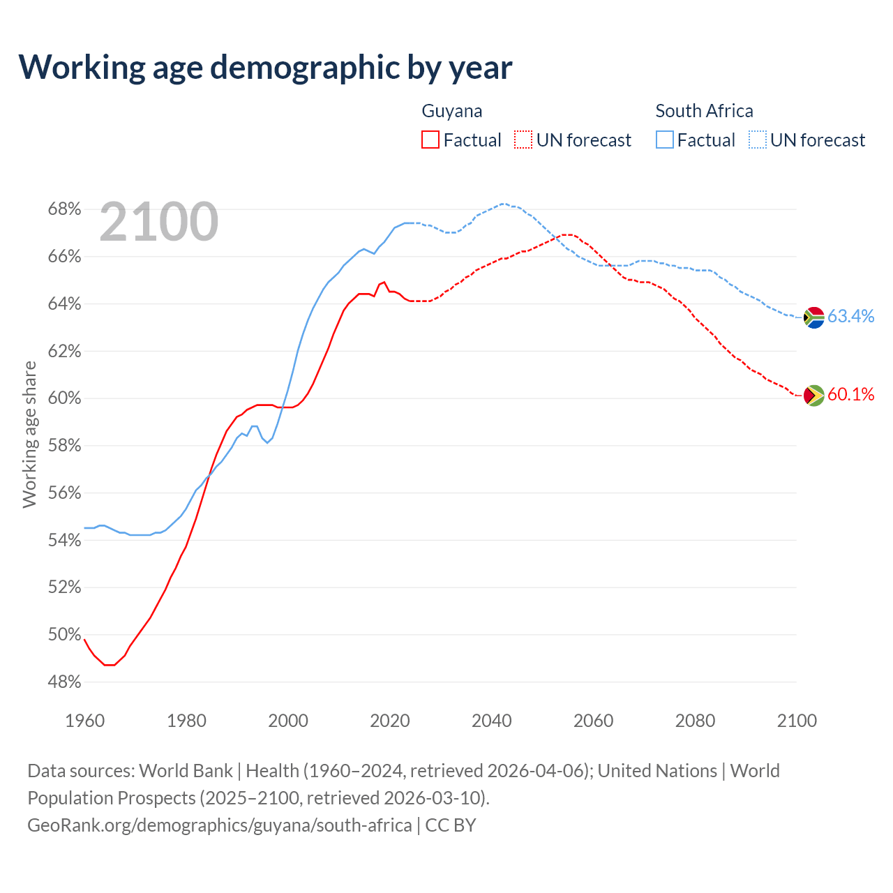 Median age Guyana vs South Africa, 1960-2100