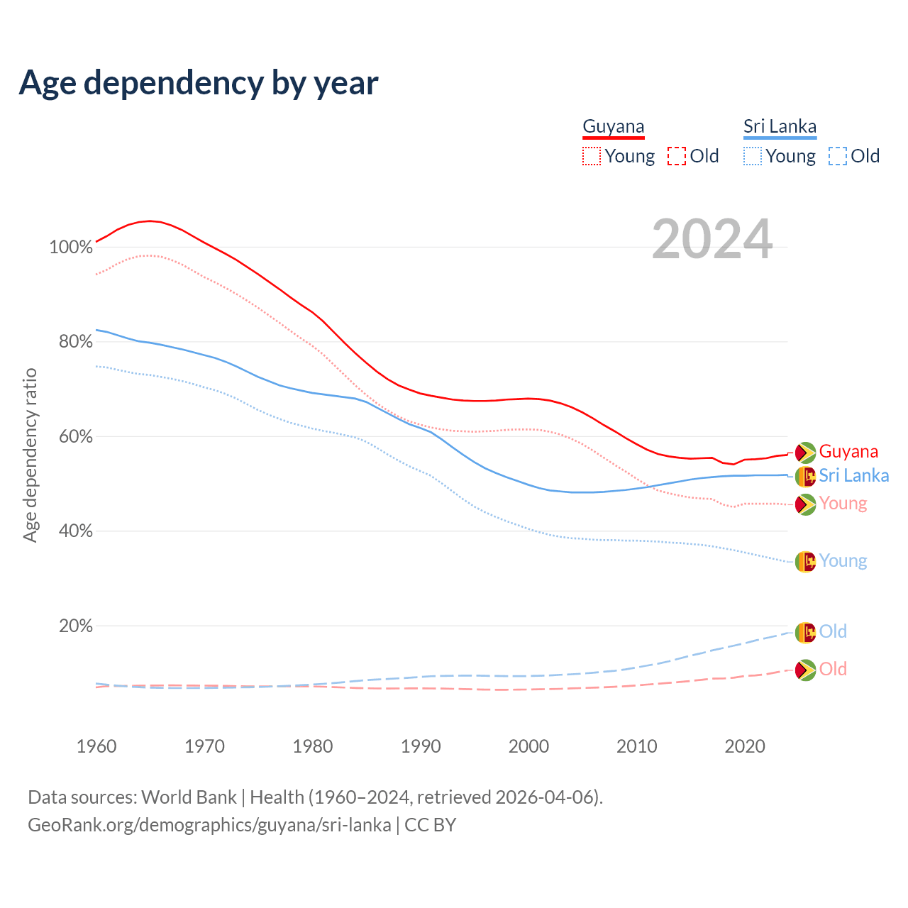 - Guyana is ranked 122/196 by median age (oldest to youngest) vs 81/196 for Sri Lanka.