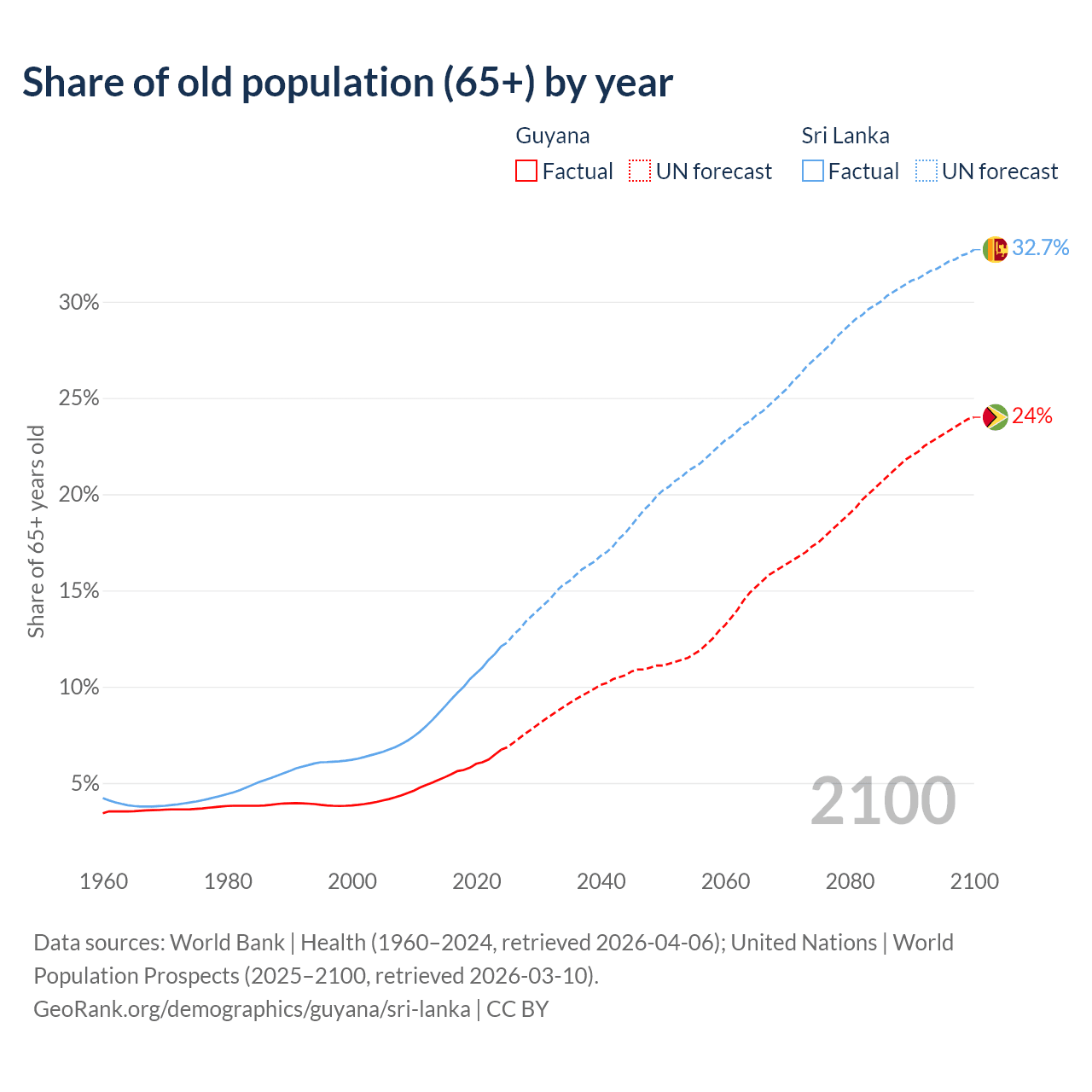 The share of older people aged 65 and over is 6.73% in Guyana and 12.1% in Sri Lanka. Life expectancy in Guyana compared to Sri Lanka .