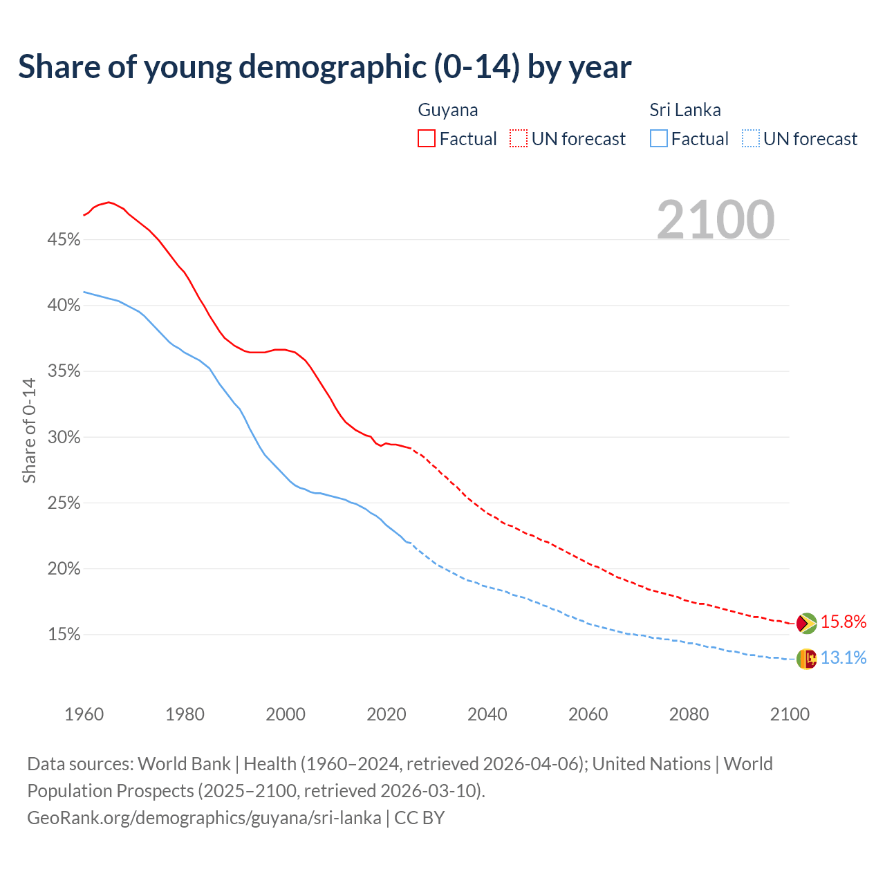 - The share of young demographic (0-15 years old) in Guyana is 29.2% vs 22% in Sri Lanka.