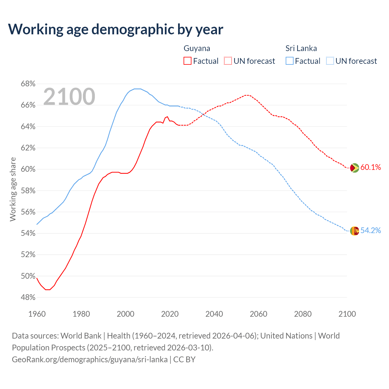- Guyana has 540K working age adults (aged 15-64) vs 14.6M in Sri Lanka.