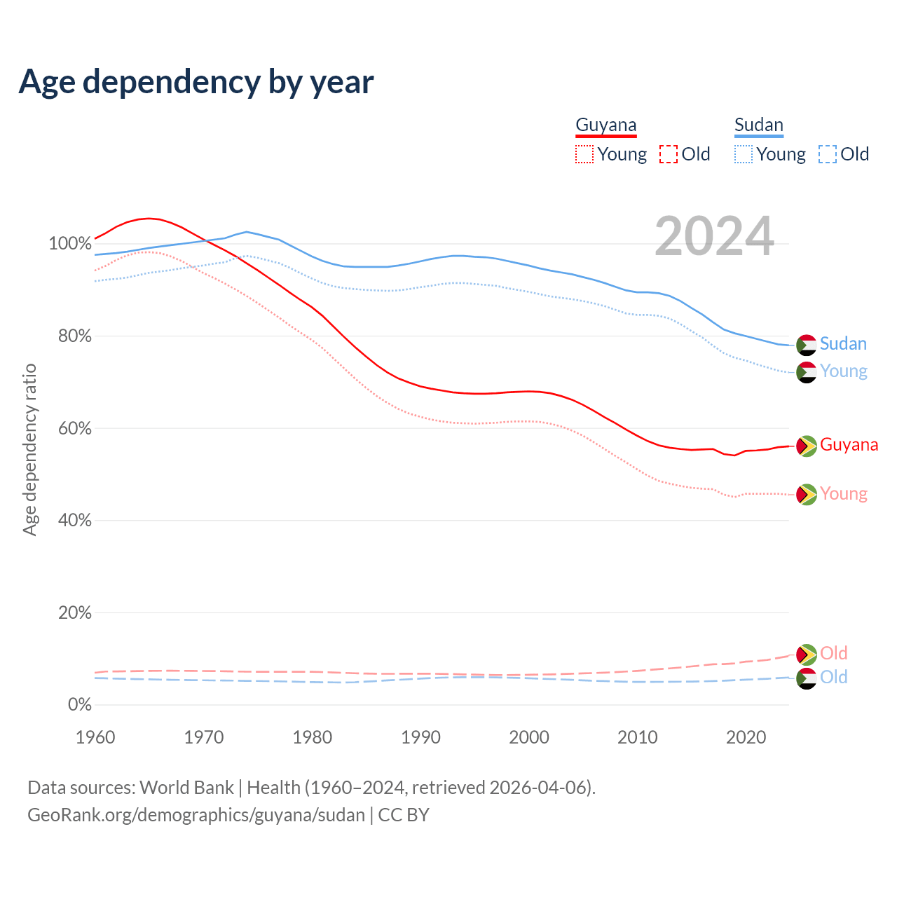 - The share of old-age demographic (65+) in Guyana is 6.73% vs 3.3% in Sudan.