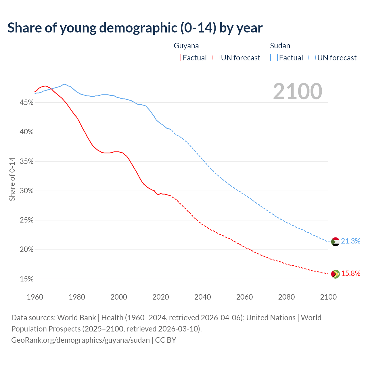- The share of young demographic (0-15 years old) in Guyana is 29.2% vs 40.5% in Sudan.