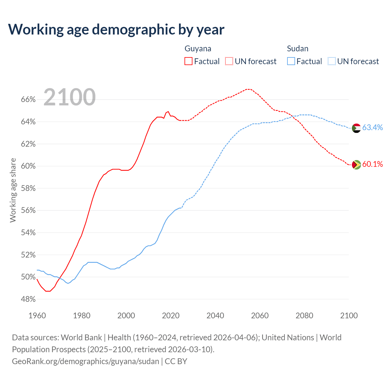 Median age Guyana vs Sudan, 1960-2100