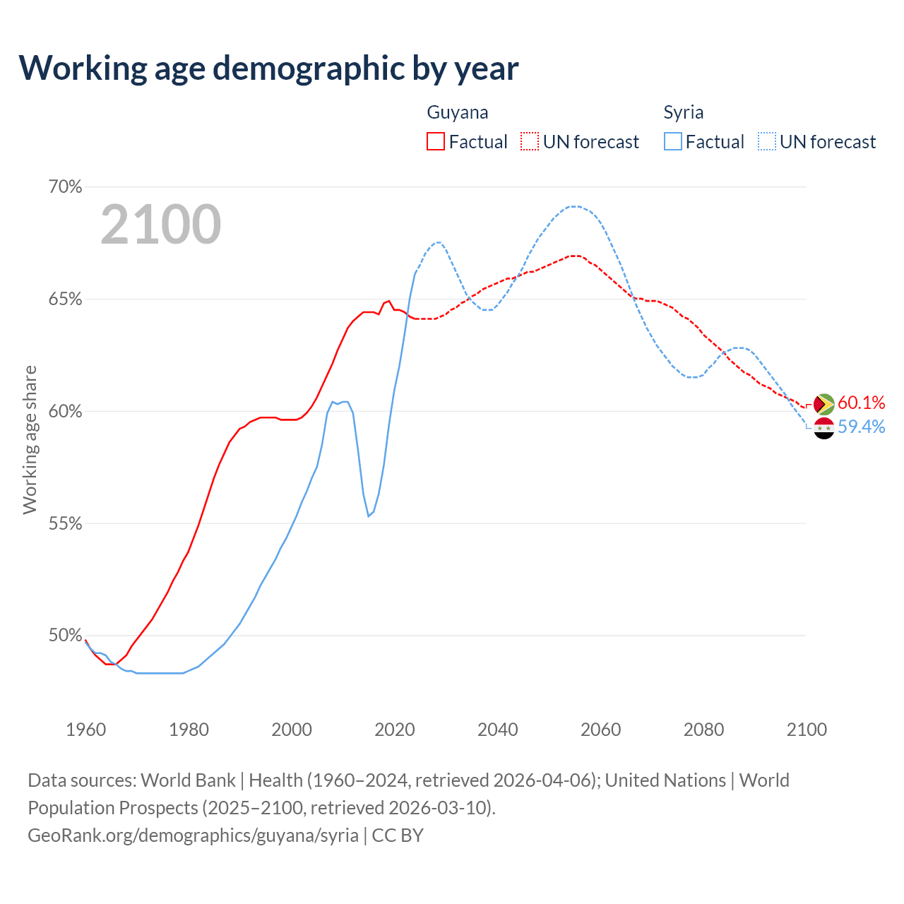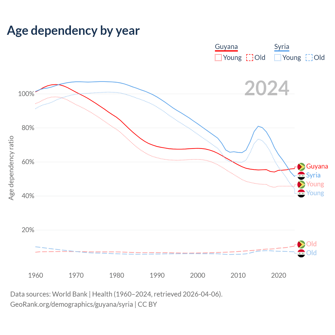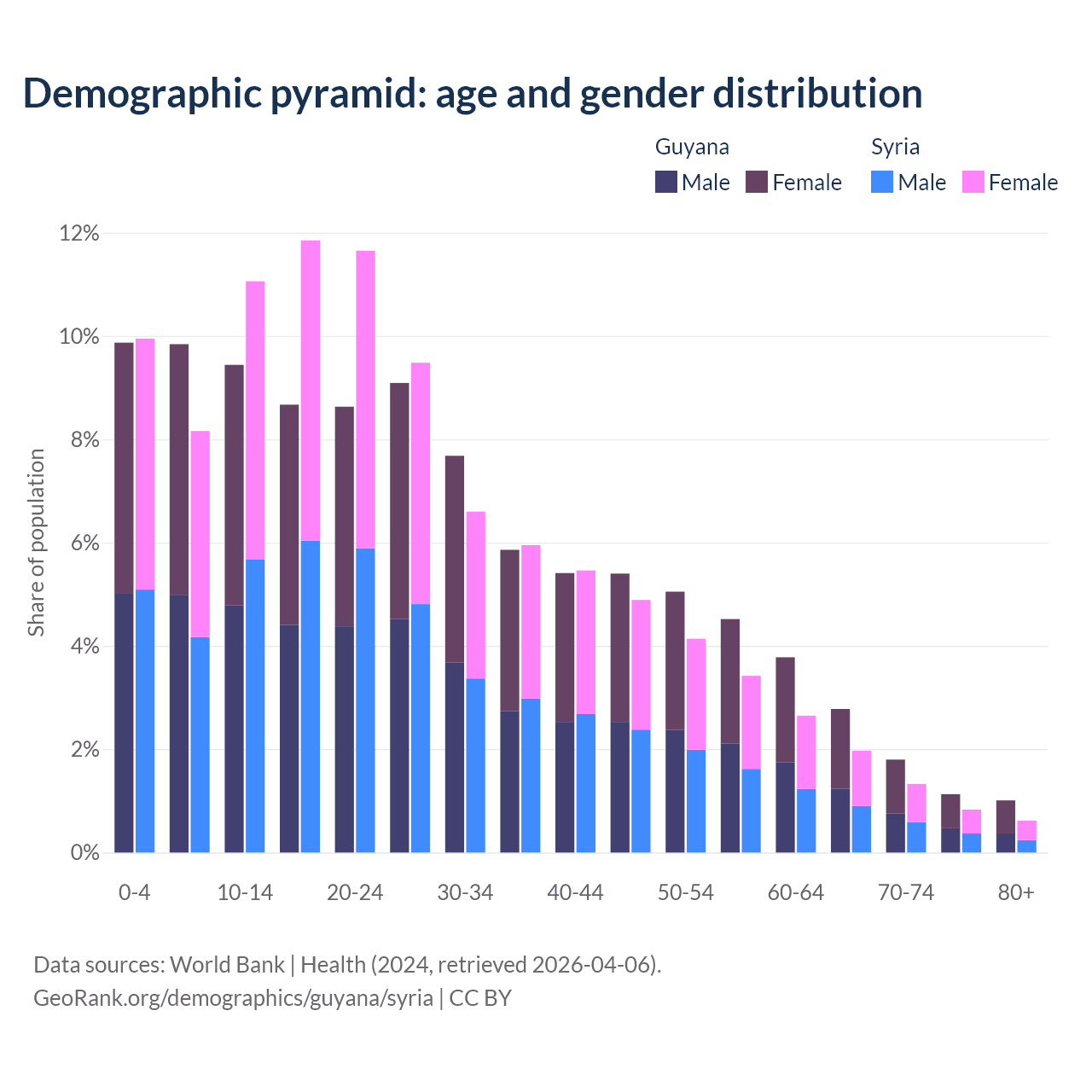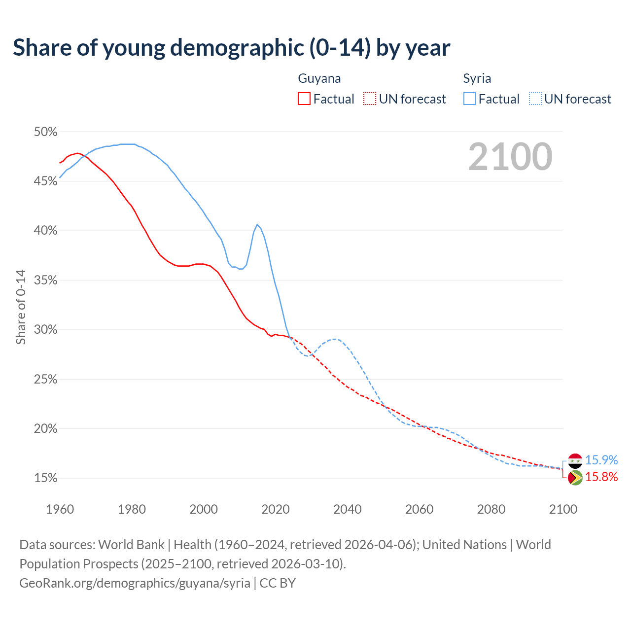- The share of young demographic (0-15 years old) in Guyana is 29.2% vs 29.2% in Syria.