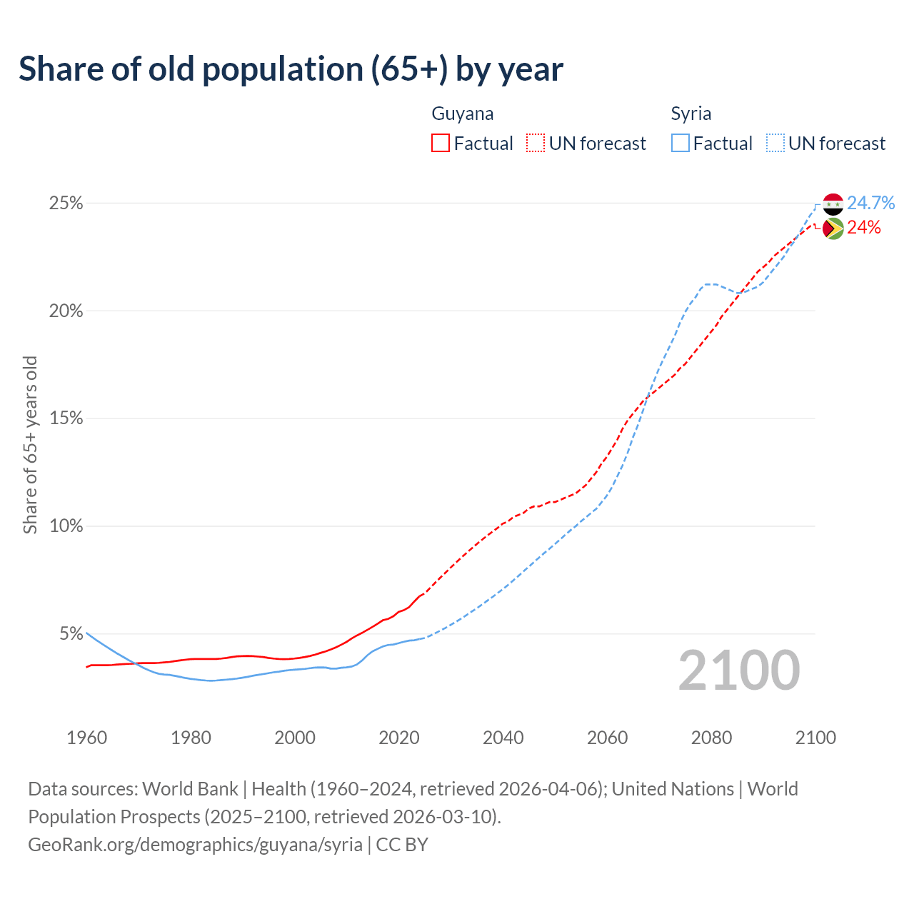 - The share of old-age demographic (65+) in Guyana is 6.73% vs 4.74% in Syria.
