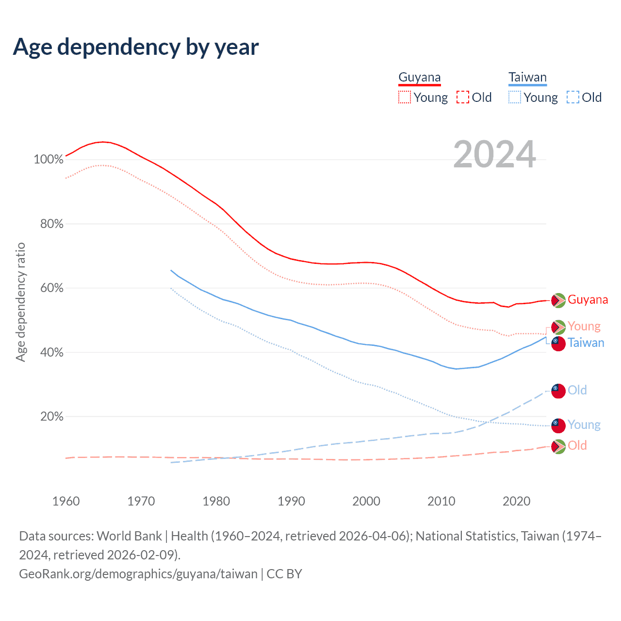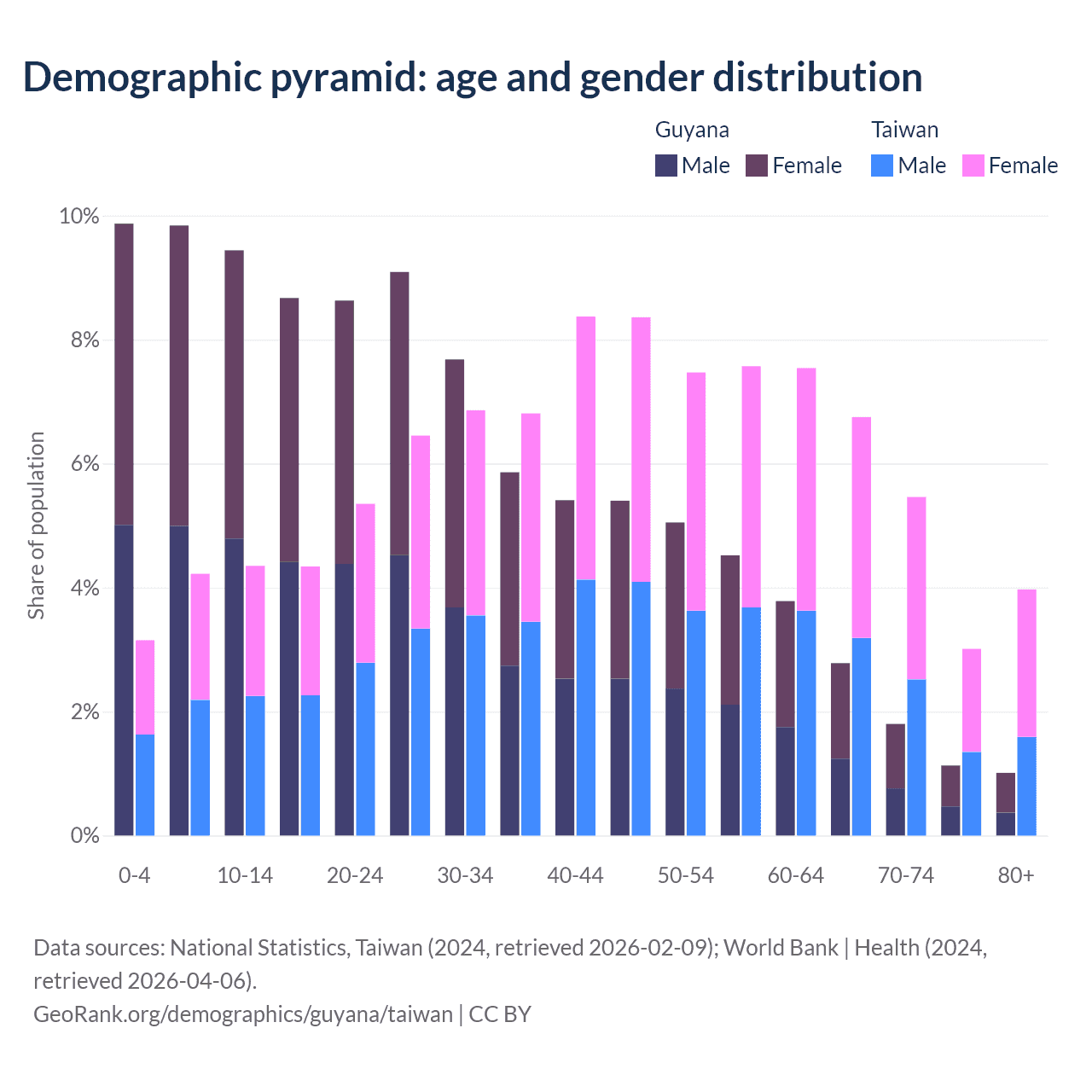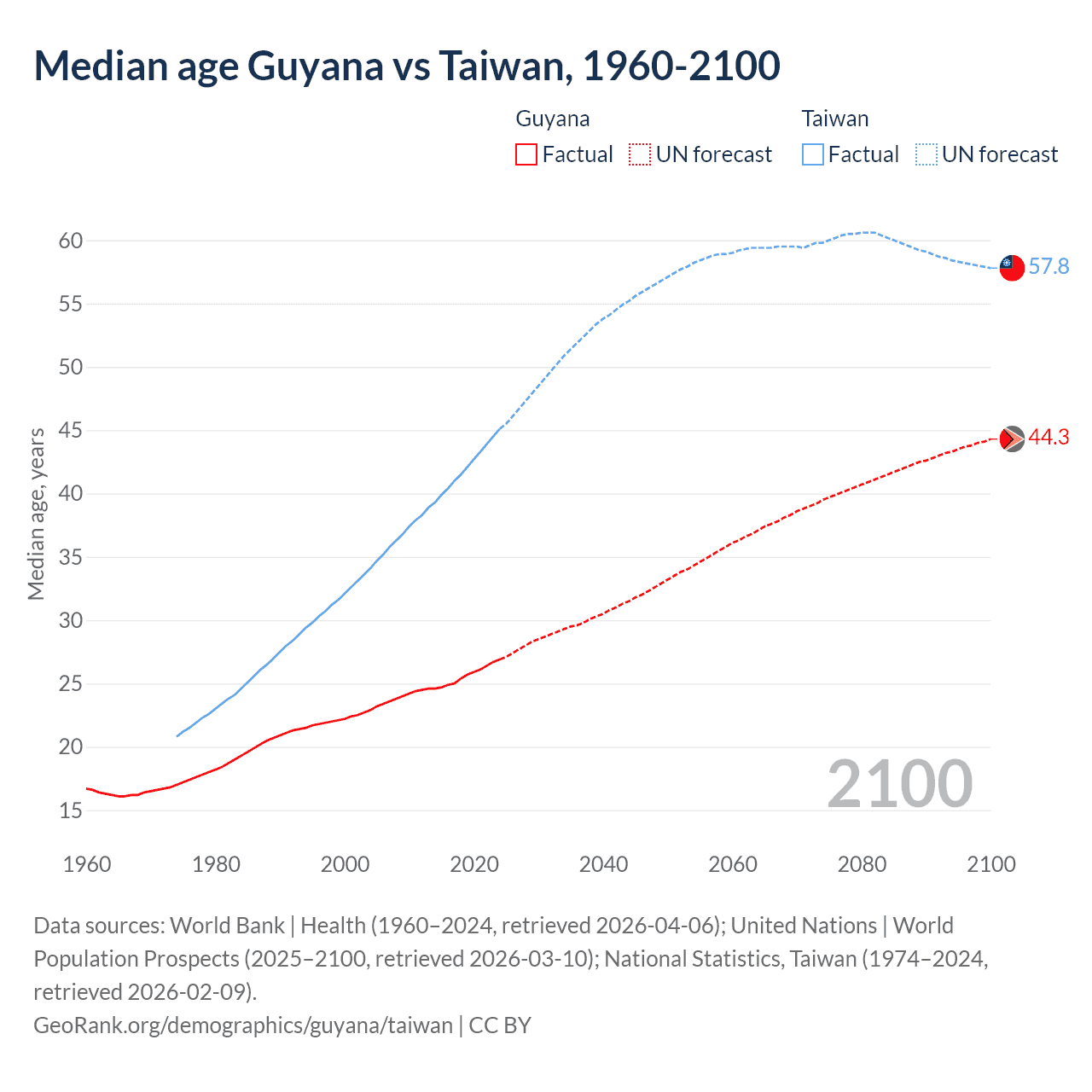 - Guyana is ranked 122/196 by median age (oldest to youngest) vs 16/196 for Taiwan.