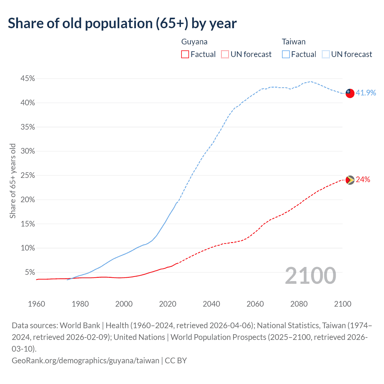 The share of older people aged 65 and over is 6.73% in Guyana and 19.2% in Taiwan. Life expectancy in Guyana compared to Taiwan .