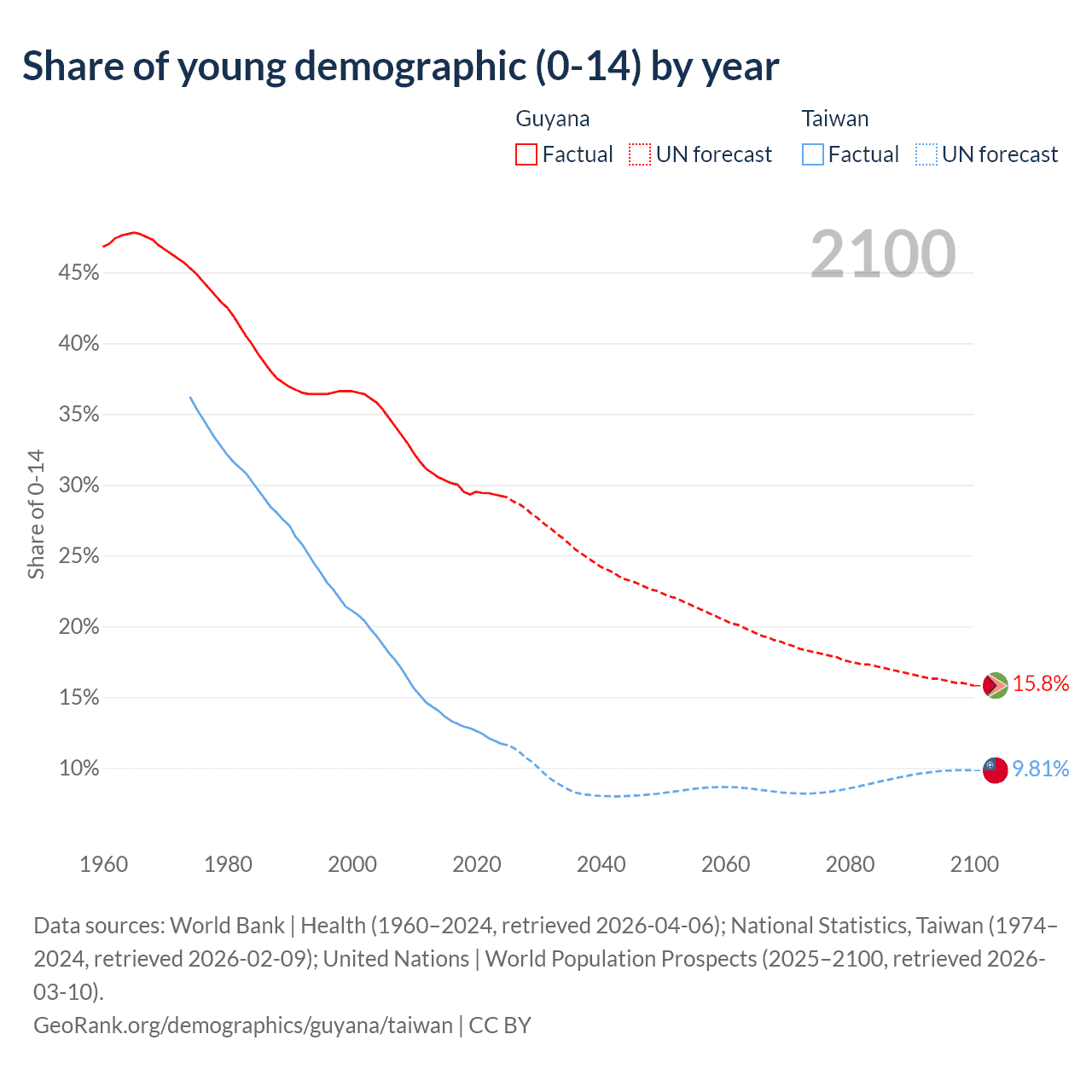 - The share of young demographic (0-15 years old) in Guyana is 29.2% vs 11.7% in Taiwan.