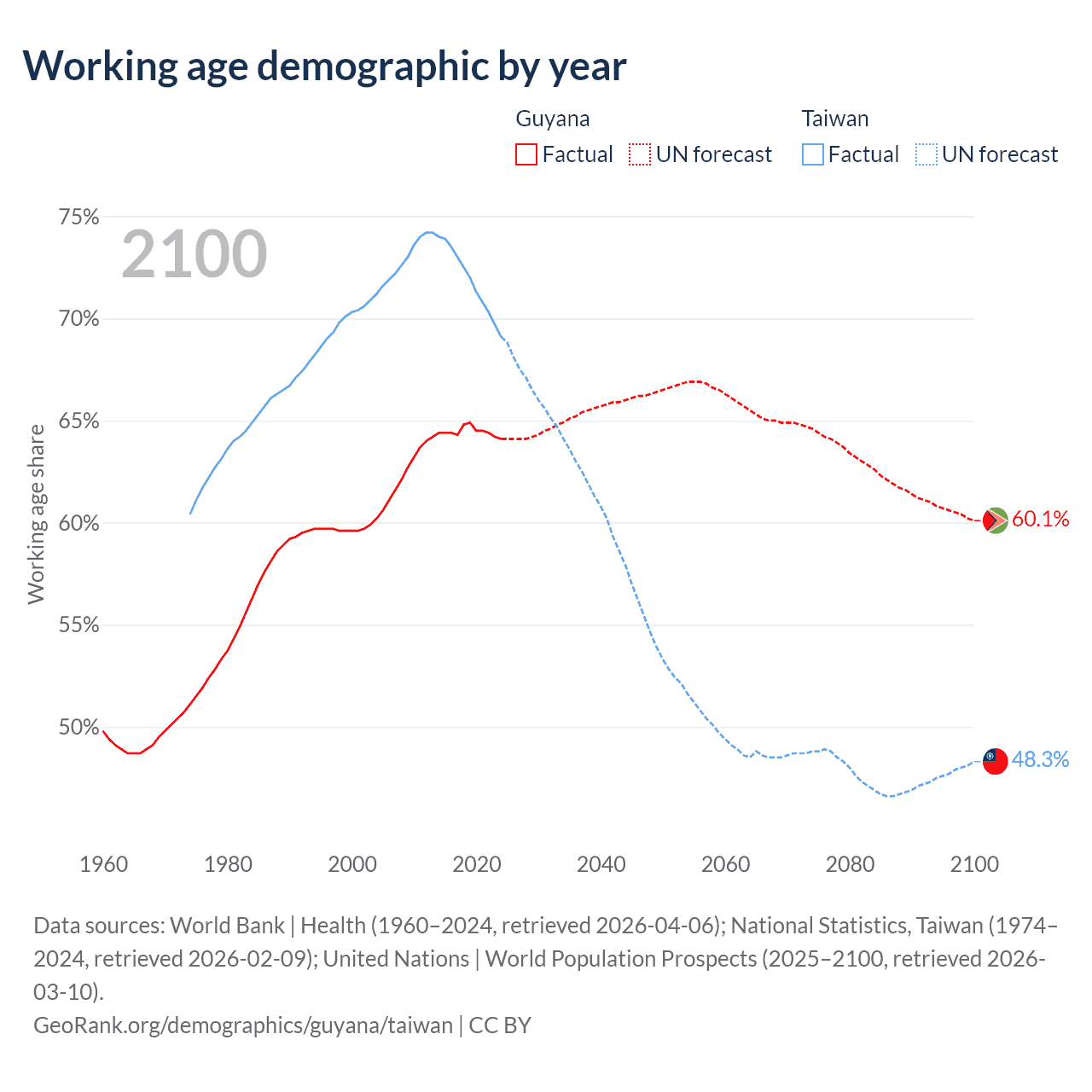- Guyana has 540K working age adults (aged 15-64) vs 16.1M in Taiwan.