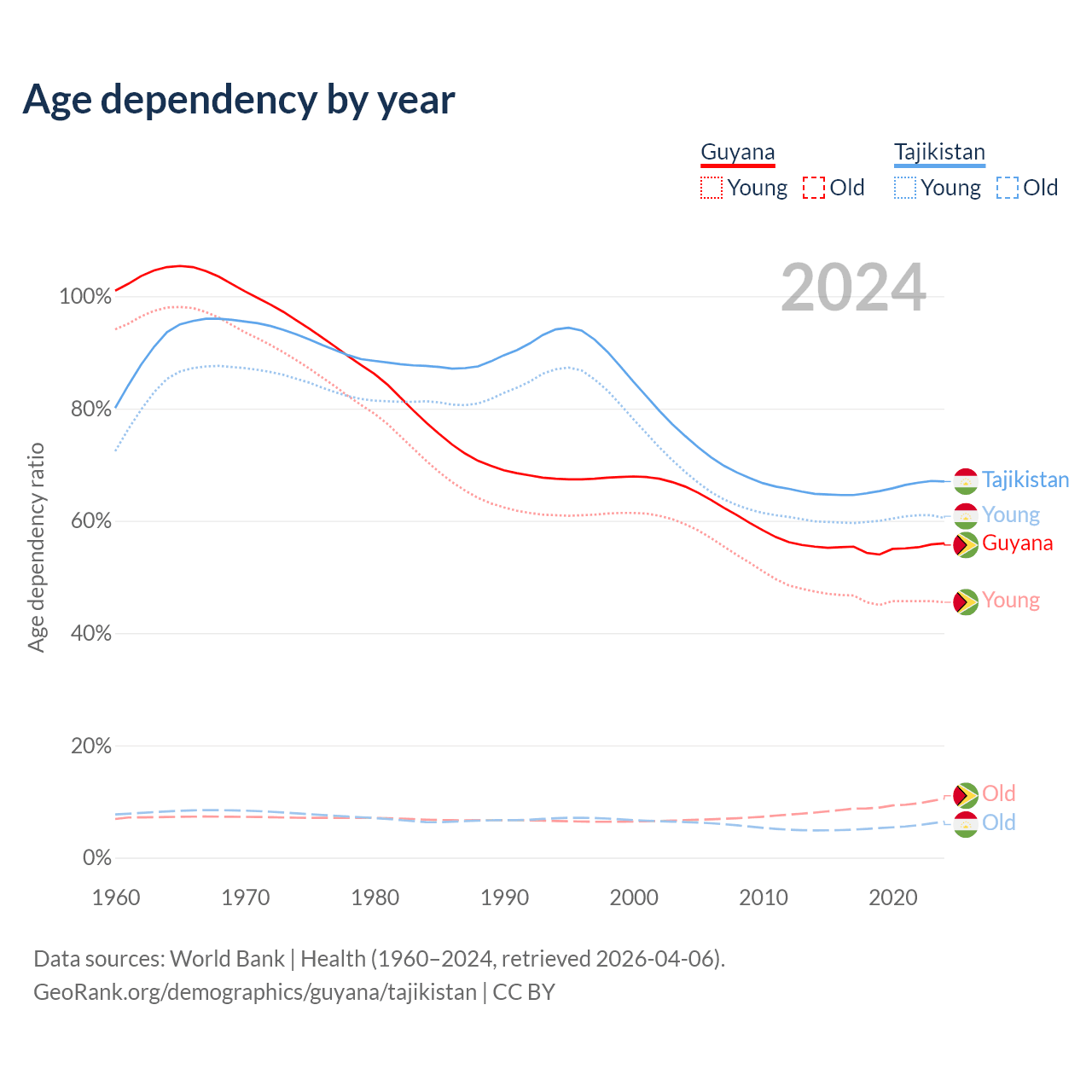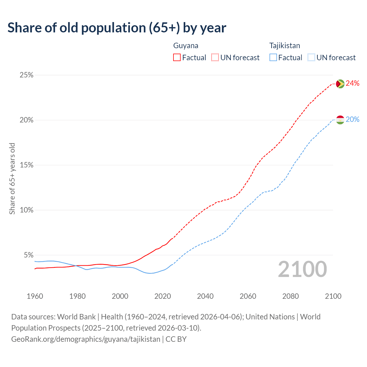 - The share of old-age demographic (65+) in Guyana is 6.73% vs 3.85% in Tajikistan.