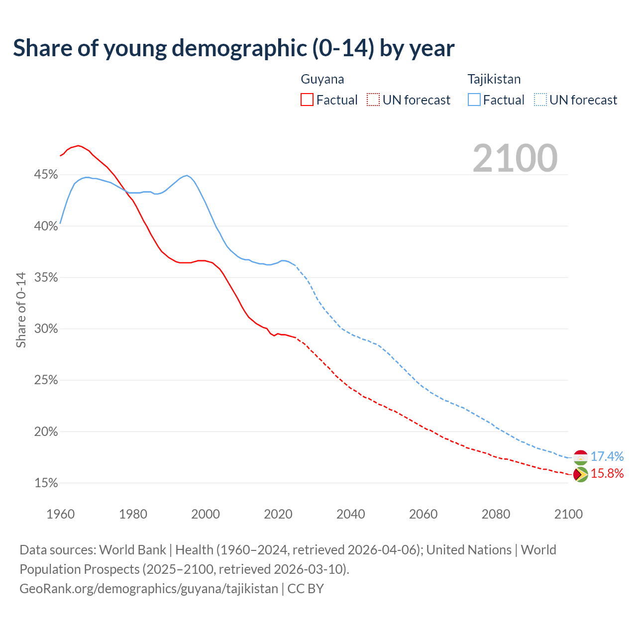 - The share of young demographic (0-15 years old) in Guyana is 29.2% vs 36.3% in Tajikistan.