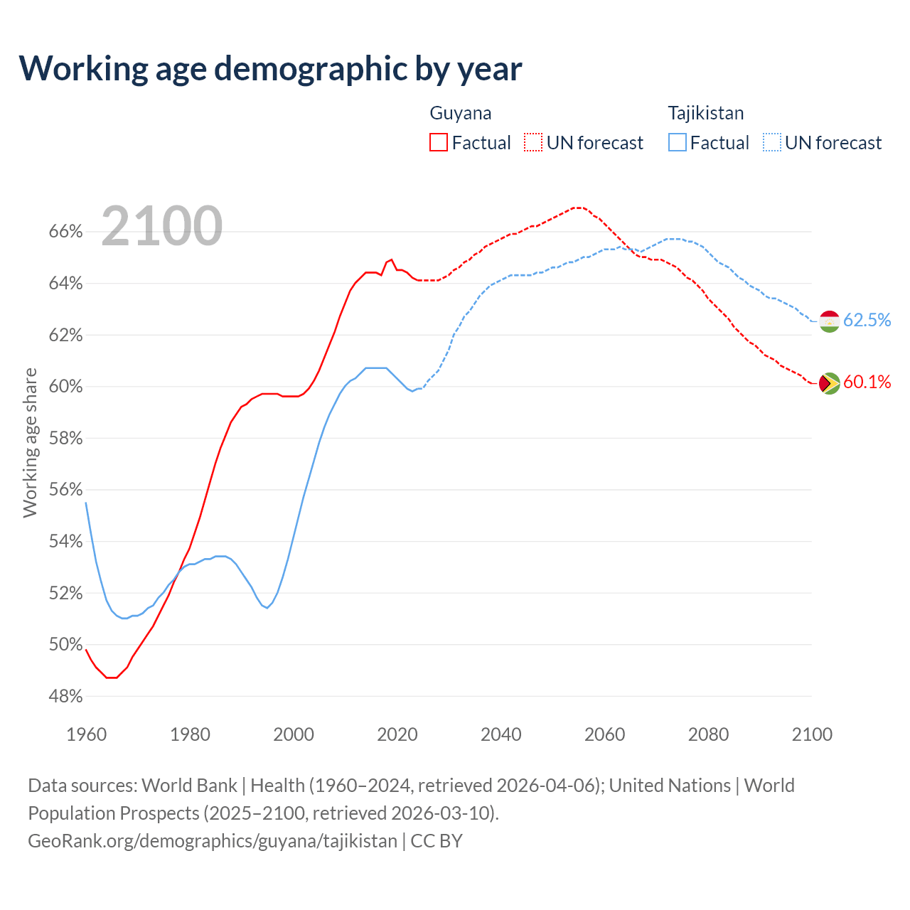 - Guyana has 540K working age adults (aged 15-64) vs 6.61M in Tajikistan.