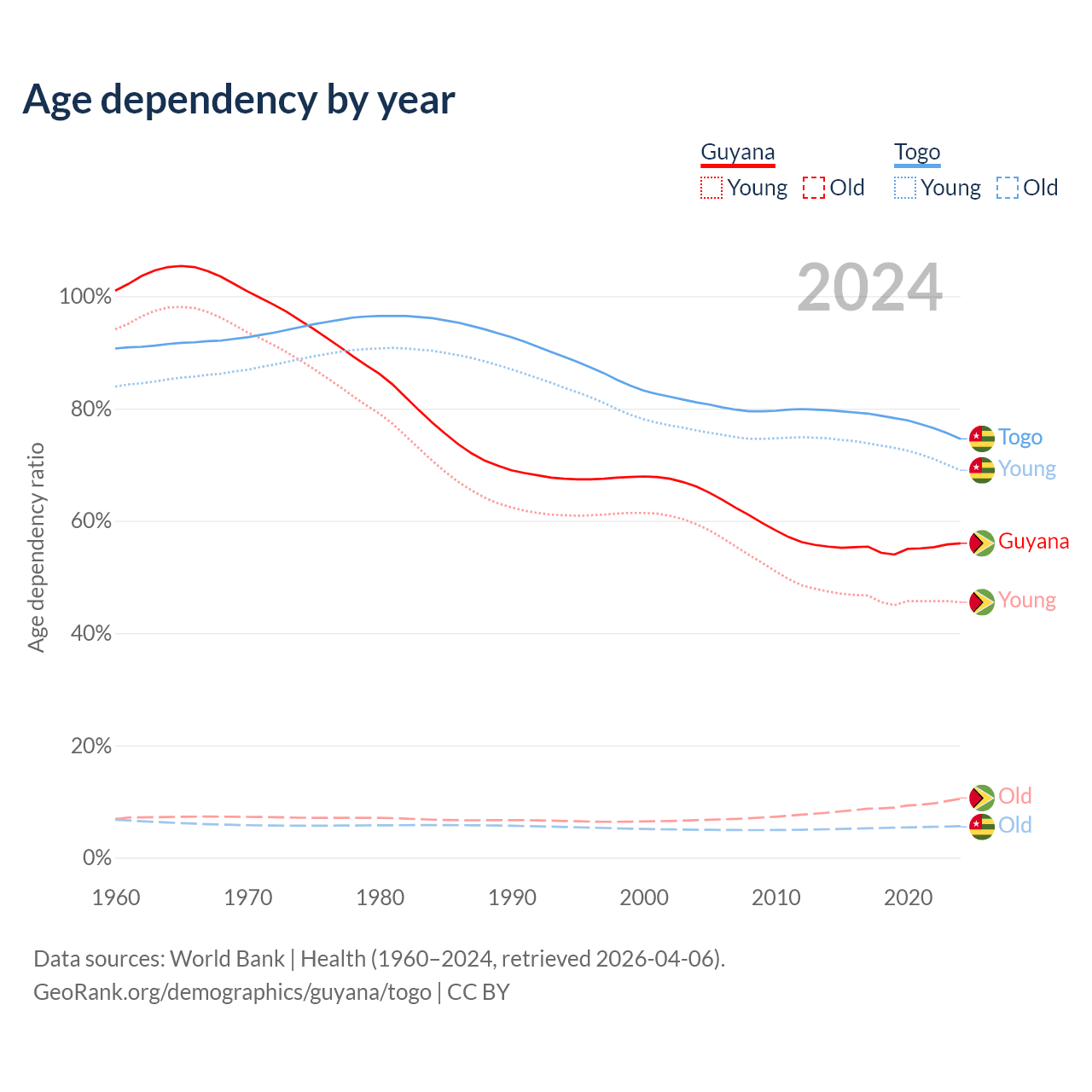 - Guyana is ranked 122/196 by median age (oldest to youngest) vs 166/196 for Togo.